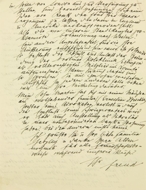 in Wien von London aus zur Verfügung zu stellen, sind bereits gefunden. Es ist eine Idee von Rank, den Fond (Verlag) hier Ware erzeugen zu lassen, die dann in England und Amerika verkauft werden soll. Also die von unserem Staatskanzler proklamierte Orientierung nach Westen! Eine andere Angelegenheit, für die Ihre Äußerung entscheidend sein wird, ist folgende. Es besteht die Absicht, aus Anlaß der Gründung der Berliner Poliklinik Eitingon als vollberechtigtes Mitglied ins Komitee aufzunehmen. Wenn Sie auch dafür sind, so sprechen Sie mit ihm ohne weiteren Aufschub. In jedem anderen Falle bitten wir um Ihre Mitteilung darüber.