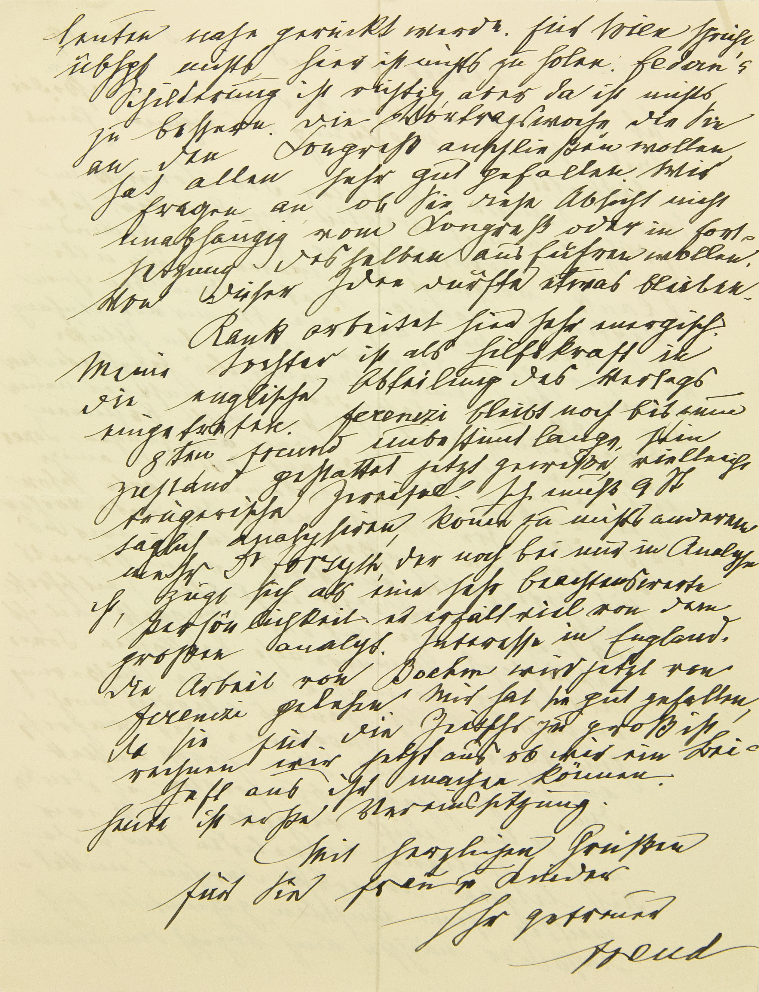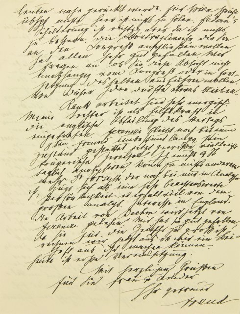 Ihren und Eitingons Vorschlag, den Kongreß im Frühjahr und nach Berlin einzuberufen, habe ich [in] einer Komiteesitzung Ferenczi, Freund und Rank vorgelegt. Sie waren zunächst alle kaptiviert, langsam traten dann bei ihnen die Bedenken auf, die bei mir von Anfang an herrschend gewesen waren. Am Schlusse waren wir einer Meinung. Das Hauptbedenken war, daß wir, besonders bei unserer neuen Orientierung nach Westen, nichts be- stimmen können, ohne bei Jones anzufragen. Jones legt aber Wert darauf, diesmal einige Amerikaner herzubekommen, und sagte schon, daß die ihre Reise viele Monate vorher vorbereiten müssen. Auch halten wir es für zweifellos günstiger, wenn bereits einige Nummern der englischen Zeitschrift vorliegen, ehe sich der Kongreß mit ihr beschäftigt. Es wurde also beschlossen, Jones Mitteilung zu machen und seine Äußerung einzuholen. Ich fand es überdies noch günstiger, die Woche, die der Kongreß ausfüllen soll, dem Herbst anstatt dem Frühjahr abzufordern. Ich denke, wir sollen nicht vergessen, daß wir nach Holland eingeladen sind, und da die letzten Kongresse durchaus mittelmächtig sein mußten, geziemte es sich, daß der nächste auch topisch den Entente- -