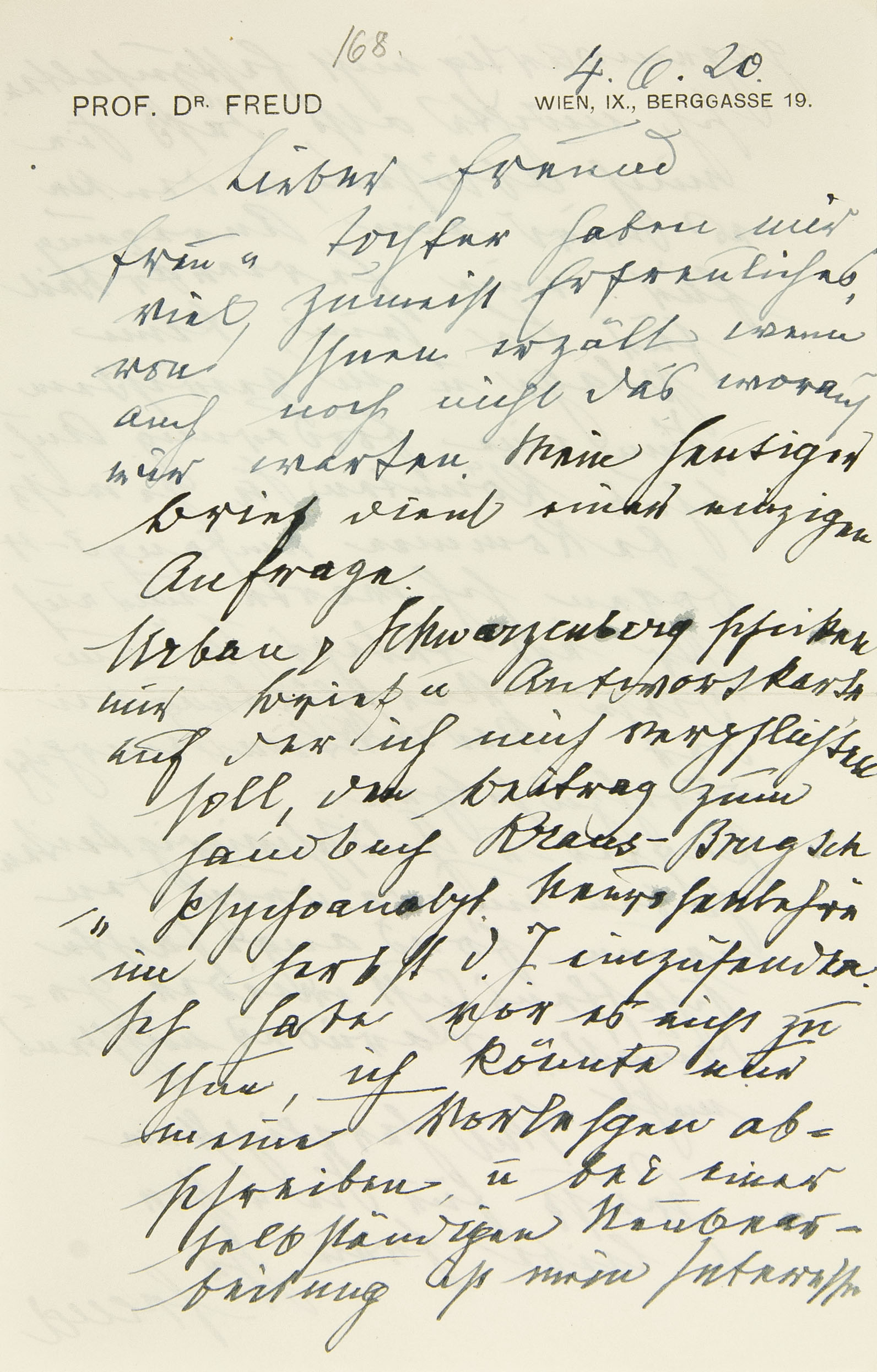 Urban & Schwarzenberg schicken mir Brief und Antwortkarte, auf der ich mich verpflichten soll, den Beitrag zum Handbuch Kraus-Brugsch »Psychoanalytische Neurosenlehre[«] im Herbst d. J. einzusenden. Ich habe vor es nicht zu tun, ich könnte nur meine Vorlesungen abschreiben, und bei einer selbständigen Neubearbeitung ist mein Interesse -