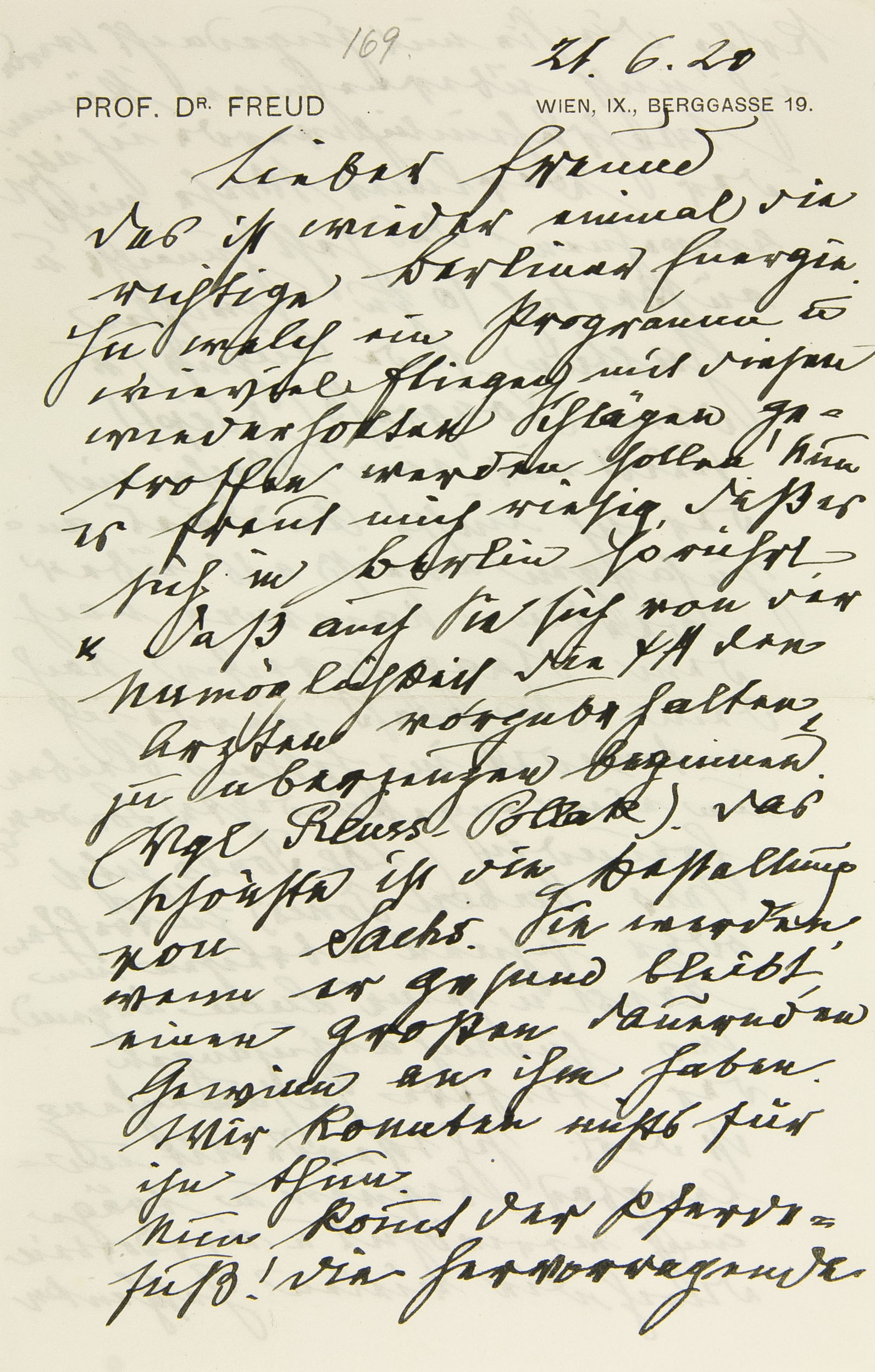 Das ist wieder einmal die richtige Berliner Energie. Hu, welch ein Programm und wieviel Fliegen mit diesen wiederholten Schlägen getroffen werden sollen! Nun es freut mich riesig, daß es sich in Berlin so rührt, und daß auch Sie sich von der Unmöglichkeit, die Psychoanalyse den Ärzten vorzubehalten, zu überzeugen beginnen. (Vgl. Reuss – Pollak.) Das schönste ist die Bestallung von Sachs. Sie werden, wenn er gesund bleibt, einen großen dauernden Gewinn an ihm haben. Wir konnten nichts für ihn tun.