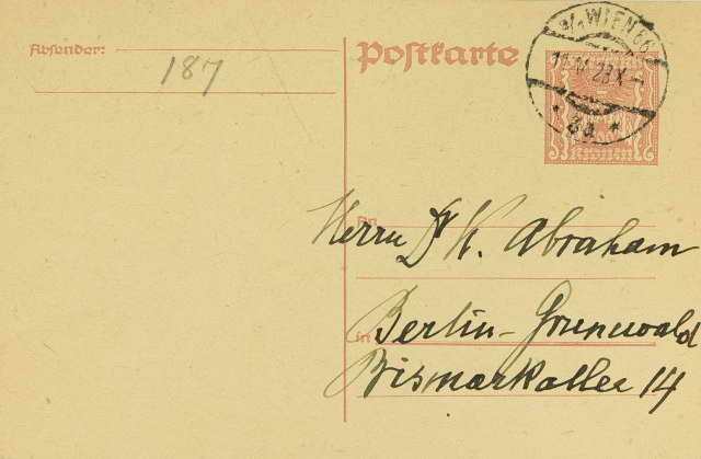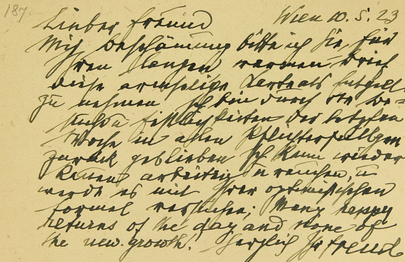 Mit Beschämung bitte ich Sie, für Ihren langen, warmen Brief diese armselige Karte als Entgelt zu nehmen. Ich bin durch die Besuche und Festlichkeiten der letzten Woche in allen Pflichterfüllungen zurück geblieben. Ich kann wieder kauen, arbeiten und rauchen, und werde es mit Ihrer optimistischen Formel versuchen: many happy returns of the day and none of the new growth!