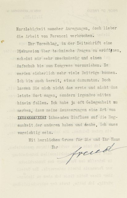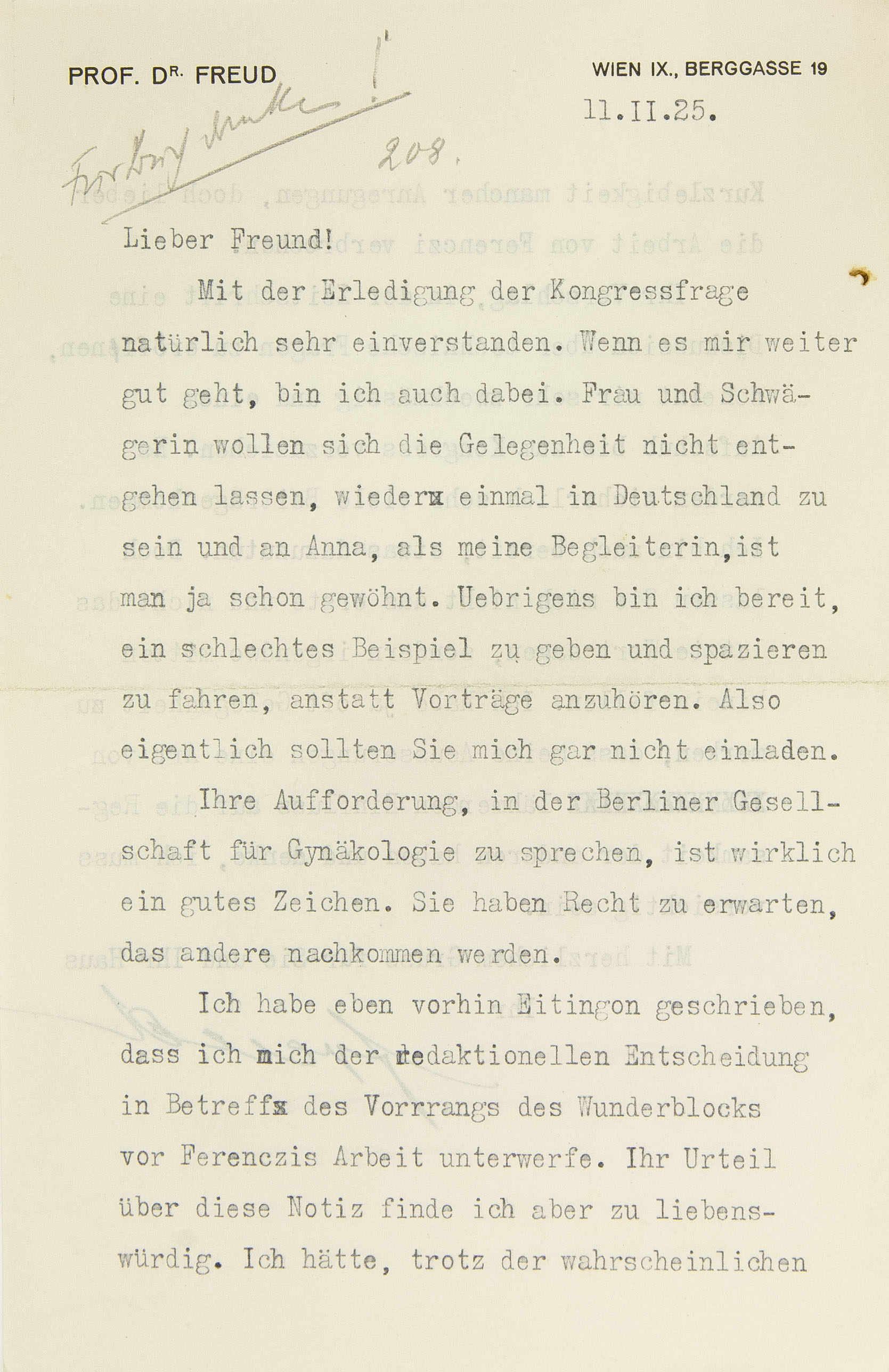 Ich habe eben vorhin Eitingon geschrieben, daß ich mich der redaktionellen Entscheidung in Betreff des Vorrangs des Wunderblocks vor Ferenczis Arbeit unterwerfe. Ihr Urteil über diese Notiz finde ich aber zu liebenswürdig. Ich hätte, trotz der wahrscheinlichen -