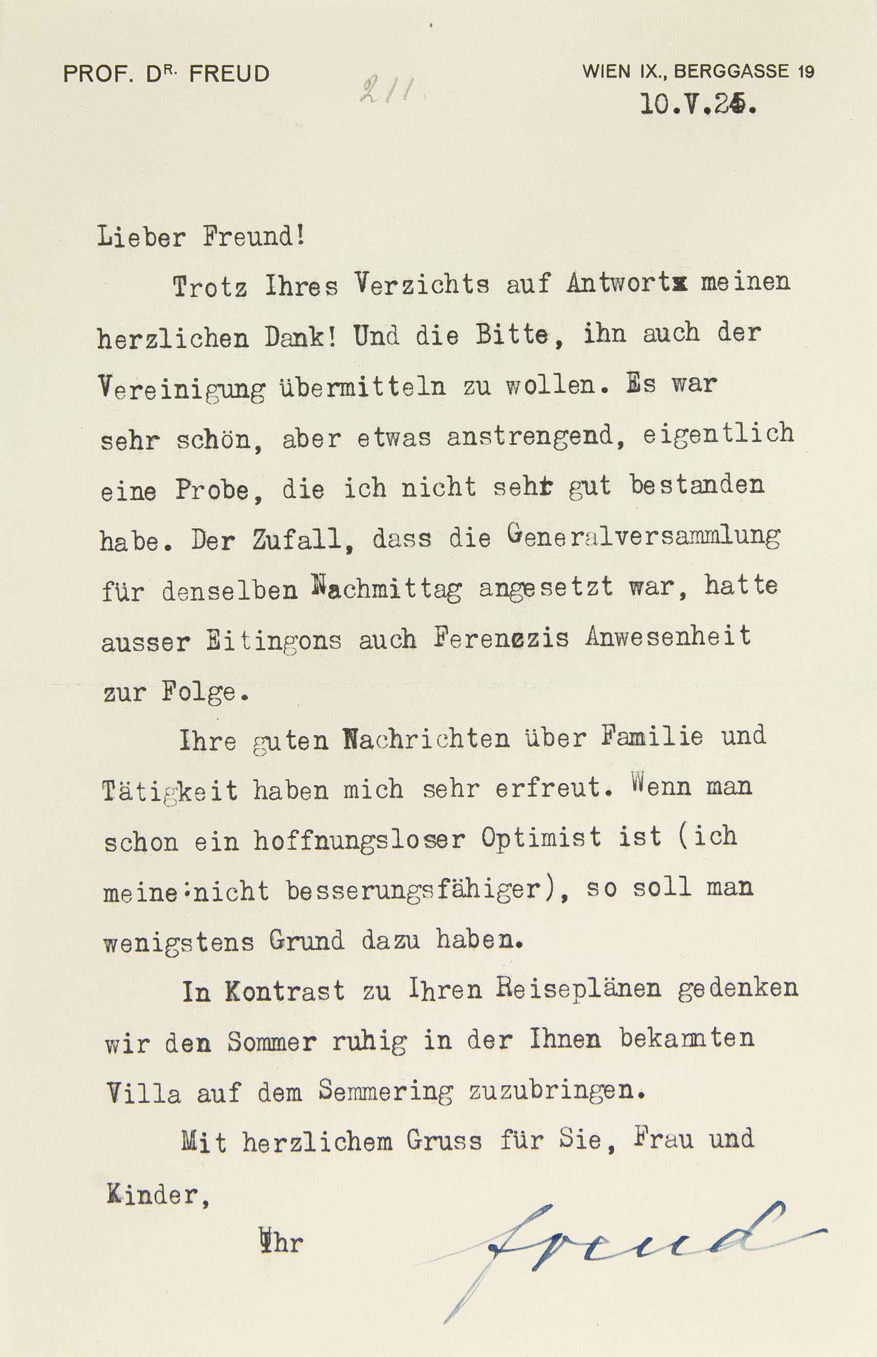 Trotz Ihres Verzichts auf Antwort meinen herzlichen Dank! Und die Bitte, ihn auch der Vereinigung übermitteln zu wollen. Es war sehr schön, aber etwas anstrengend, eigentlich eine Probe, die ich nicht sehr gut bestanden habe. Der Zufall, daß die Generalversammlung für denselben Nachmittag angesetzt war, hatte außer Eitingons auch Ferenczis Anwesenheit zur Folge.