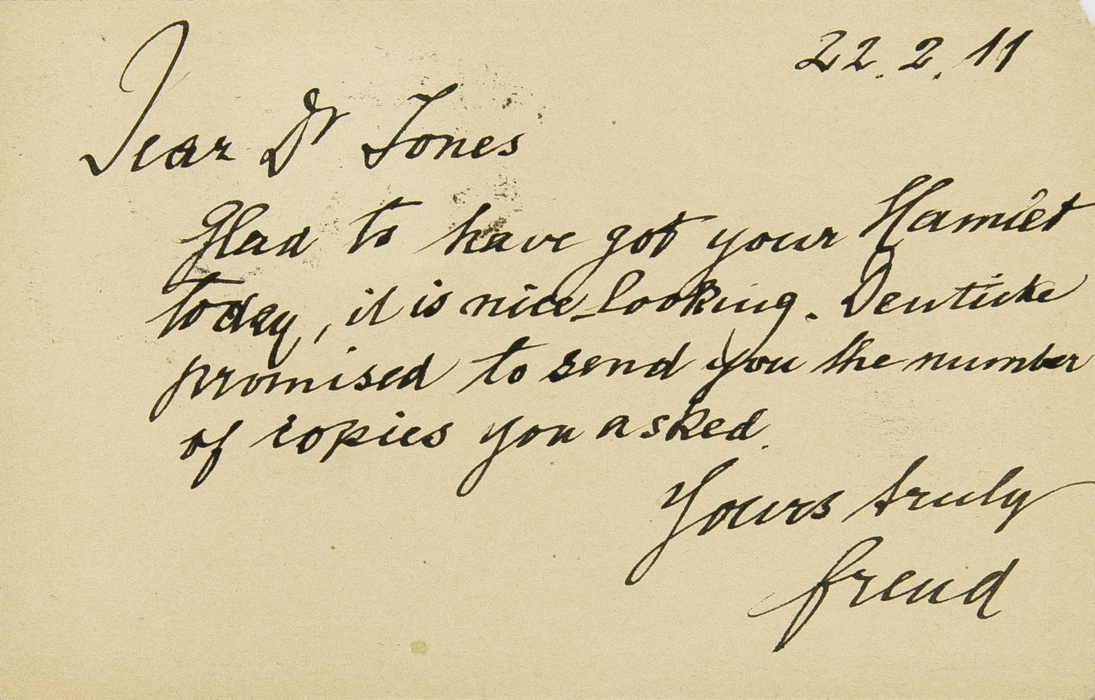 S. 22.2.11 Dear Dr Jones Glad to have got your Hamlet today, it is nice‑looking. Deuticke promised to send you the number of copies you asked. Yours truly Freud
