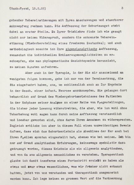Ich hoffe vor dem Missverständnis gefeit zu sein, daß ich meine Arbeit als etwas ganz Neues und Unabhängiges hinstellen möchte. Im Gegenteil möchte ich Wert darauf legen, daß ich mich noch weitgehender Übereinstimmungen mit Ihren Anschau¬ungen und stärkerer Anknüpfungen rühmen kann. Die Auffassung der Geburtsangst steht dabei an erster Stelle. Zu Ihrer Trieblehre finde ich wie gesagt nicht nur keinen Widerspruch, sondern die schönste Übereinstimmung (Wiederherstellung eines früheren Zustandes); und auch methodologisch möchte ich Ihre eigentlich analytische Auffassung, zunächst die individuellen Erklärungsmöglichkeiten zu erschöpfen, ehe man phylogenetische Gesichtspunkte heranzieht, zu meinen Gunsten anführen.