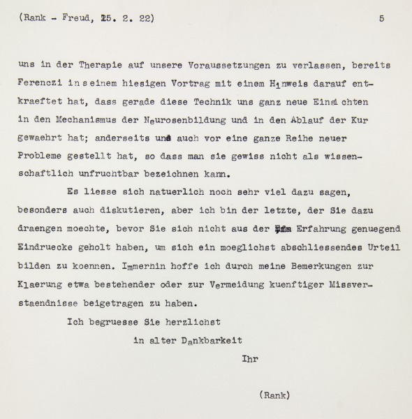 Schließlich möchte ich mir noch erlauben, darauf hinzuwei-sen, daß Ihren Einwand, wir hätten noch viel zu lernen, um uns in der Therapie auf unsere Voraussetzungen zu verlassen, bereits Ferenczi in seinem hiesigen Vortrag mit einem Hinweis darauf entkräftet hat, daß gerade diese Technik uns ganz neue Einsichten in den Mechanismus der Neurosenbildung und in den Ablauf der Kur gewährt hat; andererseits uns auch vor eine ganze Reihe neuer Probleme gestellt hat, so daß man sie gewiss nicht als wissenschaftlich unfruchtbar bezeichnen kann.