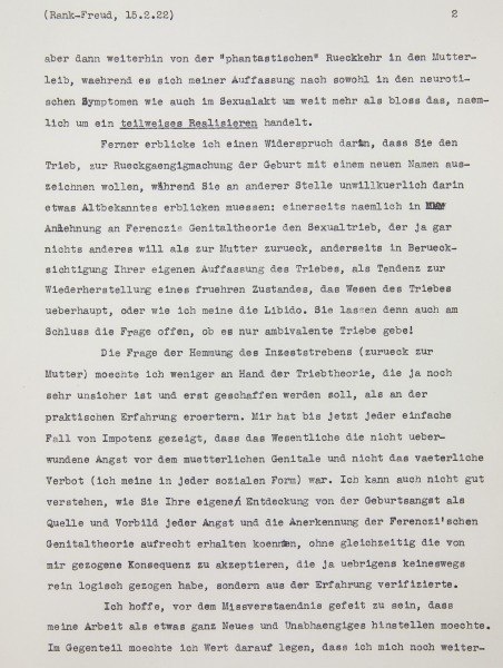 Ferner erblicke ich einen Widerspruch darin, daß Sie den Trieb zur Rückgängigmachung der Geburt mit einem neuen Namen auszeichnen wollen, während Sie an anderer Stelle unwillkürlich darin etwas Altbekanntes erblicken müssen: einerseits nämlich in Anlehnung an Ferenczis Genitaltheorie den Sexualtrieb, der ja gar nichts anderes will als zur Mutter zurück; anderseits in Berücksichtigung Ihrer eigenen Auffassung des Triebes, als Tendenz zur Wiederherstellung eines früheren Zustandes, das Wesen des Triebes überhaupt, oder wie ich meine die [sic] Libido. Sie lassen denn auch am Schluß die Frage offen, ob es nur ambivalente Triebe gebe!