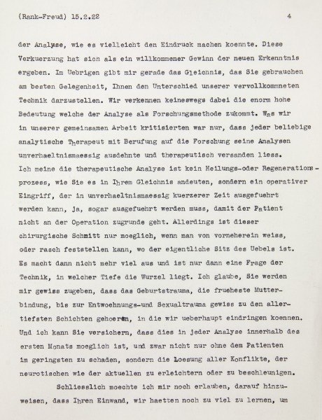Sie gelangen dort bekanntlich auf Grund des Wiedergeburts-erlebnisses des Patienten in der Endphase seiner Analyse zu einer Serie von Fragestellungen, die bisher jeder Lösung widerstrebten, die aber, wie ich wohl ohne Überhebung sagen kann, durch meine Auffassung verständlich und lösbar geworden sind, ohne darum Ihren Annahmen zu widersprechen. Zugleich erblicke ich aber in diesem Fall einen unzweideutigen Beweis dafür, daß sich das Geburtserlebnis als Abschluß der Kur auch bei Ihren Fällen spontan eingestellt hat, ebenso wie bei meinen. Ich bin nur auf Grund analytischer Erfahrungen, keineswegs spekulativ dazu gedrängt worden, dieses Erlebnis als ein allgemein analytisches, und von da aus allgemein menschliches zu verstehen. Therapeutisch glaube ich damit insoferne einen Fortschritt erzielt zu haben als etwas und zwar etwas wesentliches, was wir früher nicht erkannt hatten, jetzt von uns verstanden und therapeutisch ausgenützt werden kann. Ich lege keinen so großen Wert auf die Verkürzung der Analysen, wie es vielleicht den Eindruck machen könnte. Diese Verkürzung hat sich als ein willkommener Gewinn der neuen Erkenntnis ergeben. Im übrigen gibt mir gerade das Gleichnis, das Sie gebrauchen, am besten Gelegenheit, Ihnen den Unterschied unserer vervollkommneten Technik darzutun. Wir verkennen keineswegs dabei die enorm hohe Bedeutung, welche der Analyse als Forschungsmethode zukommt. Was wir in unserer gemeinsamen Arbeit kritisierten war nur, daß jeder beliebige analytische Therapeut mit Berufung auf die Forschung die Behandlung unverhältnismäßig ausdehnte und therapeutisch versanden ließ. Ich meine therapeutische Analyse ist kein Heilungs- oder Regenerationsprozeß, wie Sie es in Ihrem Gleichnis andeuten, sondern ein operativer Eingriff, der in unverhältnismäßig kürzerer Zeit ausgeführt werden kann, ja sogar ausgeführt werden muß, damit der Patient nicht an der Operation zu Grunde geht. Allerdings ist dieser chirurgische Schnitt nur möglich, wenn man von vornherein weiß, oder rasch feststellen kann, wo der eigentliche Sitz des Übels ist. Es macht dann nicht mehr viel aus und ist dann nur eine Frage der Technik, in welcher Tiefe die Wurzel liegt. Ich glaube Sie werden mir gewiss zugeben, daß das Geburtstrauma, die früheste Mutterbindung, bis zum Entwöhnungs- und Sexualtrauma gewiss zu den allertiefsten Schichten gehören, in die wir überhaupt eindringen können. Und ich kann Sie versichern, daß dies in jeder Analyse innerhalb des ersten Monats möglich ist, und zwar nicht nur ohne dem Patienten im geringsten zu schaden, sondern die Lösung aller Konflikte, der neurotischen wie der aktuellen, zu erleichtern oder zu beschleunigen.