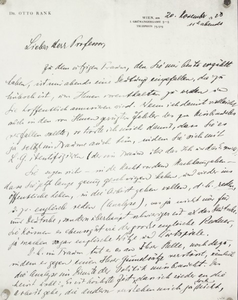 Zu dem witzigen Traum, den Sie mir heute erzählt haben, ist mir abends eine Deutung eingefallen, die zu hübsch ist, um Ihnen vorenthalten zu werden und Sie hoffentlich amüsieren wird. Wenn ich damit vielleicht auch in den von Ihnen gerügten Fehler des psa Missbrauches verfallen sollte, so tröste ich mich damit, daß Sie es ja selbst im Traume auch tun, indem Sie sich mit L.G. [sic] identifizieren (der im Traum über das Ich und das Es spricht).