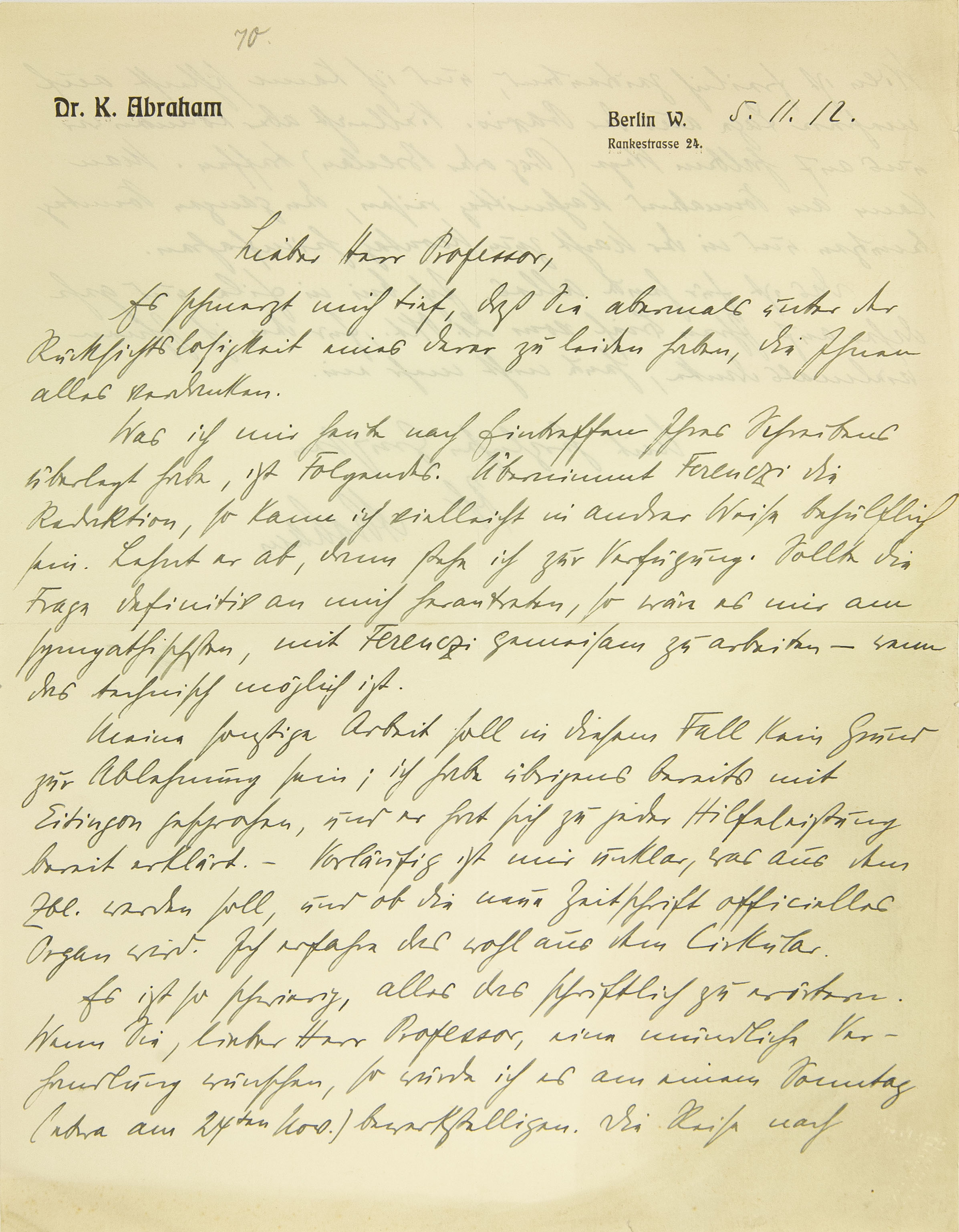 Es schmerzt mich tief, daß Sie abermals unter der Rücksichtslosigkeit eines derer zu leiden haben, die Ihnen alles verdanken. Was ich mir heute nach Eintreffen Ihres Schreibens überlegt habe, ist folgendes. Übernimmt Ferenczi die Redaktion, so kann ich vielleicht in andrer Weise behilflich sein. Lehnt er ab, dann stehe ich zur Verfügung. Sollte die Frage definitiv an mich herantreten, so wäre es mir am sympathischsten, mit Ferenczi gemeinsam zu arbeiten – wenn das technisch möglich ist. Meine sonstige Arbeit soll in diesem Fall kein Grund zur Ablehnung sein; ich habe übrigens bereits mit Eitingon gesprochen, und er hat sich zu jeder Hilfeleistung bereit erklärt. – Vorläufig ist mir unklar, was aus dem Zentralblatt werden soll, und ob die neue Zeitschrift offizielles Organ wird. Ich erfahre das wohl aus dem Zirkular. Es ist so schwierig, alles das schriftlich zu erörtern. Wenn Sie, lieber Herr Professor, eine mündliche Verhandlung wünschen, so würde ich es an einem Sonntag (etwa am 24. November) be- werkstelligen. Die Reise nach