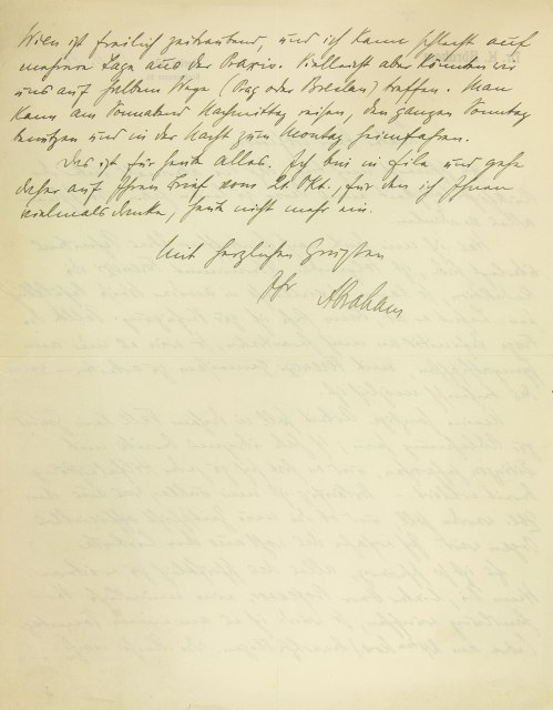 Wien ist freilich zeitraubend, und ich kann schlecht auf mehrere Tage aus der Praxis. Vielleicht aber könnten wir uns auf halbem Wege (Prag oder Breslau) treffen. Man kann am Sonnabend nachmittag reisen, den ganzen Sonntag benutzen und in der Nacht zum Montag heimfahren. Das ist für heute alles. Ich bin in Eile und gehe daher auf Ihren Brief vom 21. Oktober, für den ich Ihnen vielmals danke, heute nicht mehr ein. Mit herzlichen Grüßen Ihr Abraham