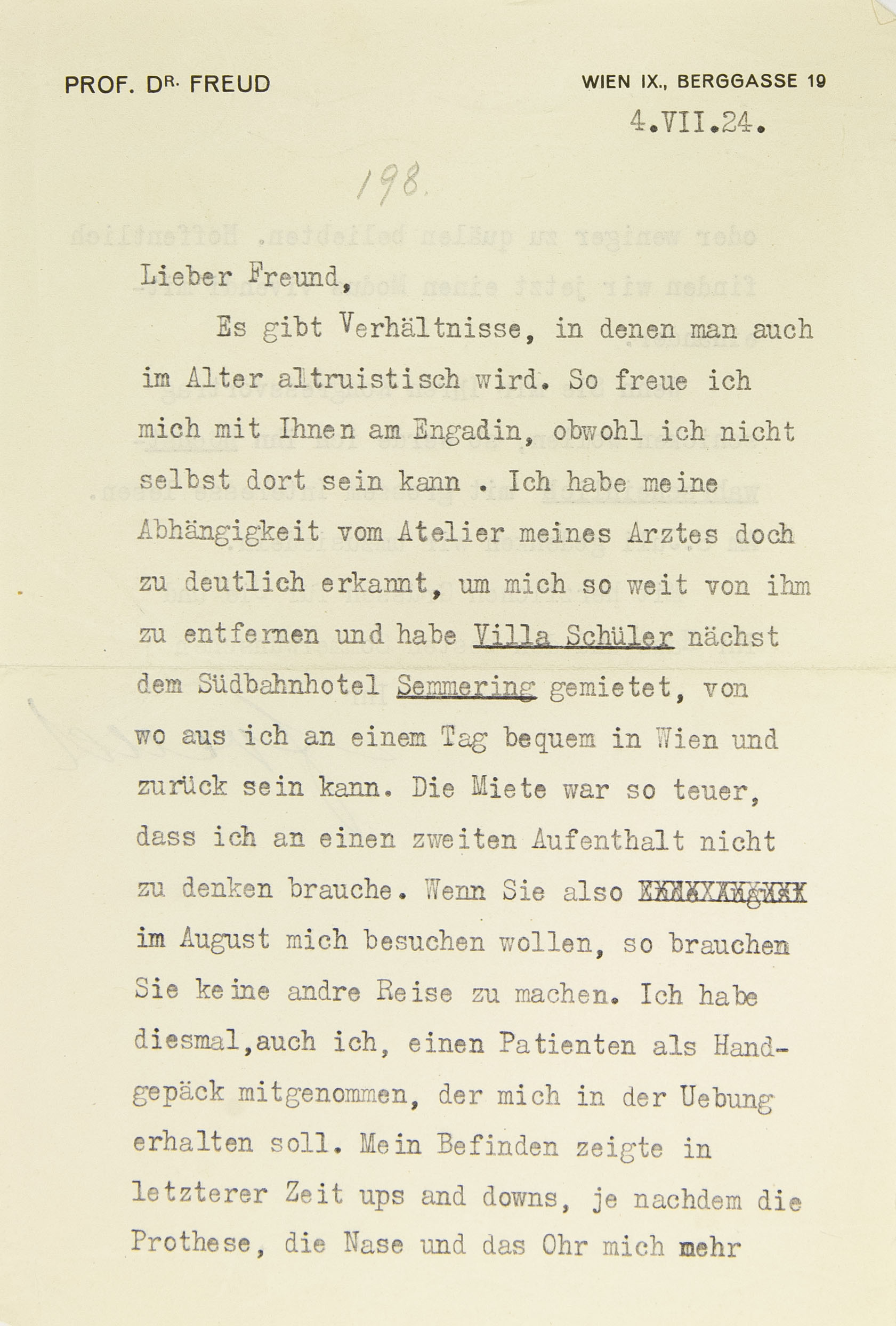Es gibt Verhältnisse, in denen man auch im Alter altruistisch wird. So freue ich mich mit Ihnen am Engadin, obwohl ich nicht selbst dort sein kann. Ich habe meine Abhängigkeit vom Atelier meines Arztes doch zu deutlich erkannt, um mich so weit von ihm zu entfernen und habe Villa Schüler nächst dem Südbahnhotel Semmering gemietet, von wo aus ich an einem Tag bequem in Wien und zurück sein kann. Die Miete war so teuer, daß ich an einen zweiten Aufenthalt nicht zu denken brauche. Wenn Sie also im August mich besuchen wollen, so brauchen Sie keine andre Reise zu machen. Ich habe diesmal, auch ich, einen Patienten als Handgepäck mitgenommen, der mich in der Übung erhalten soll.