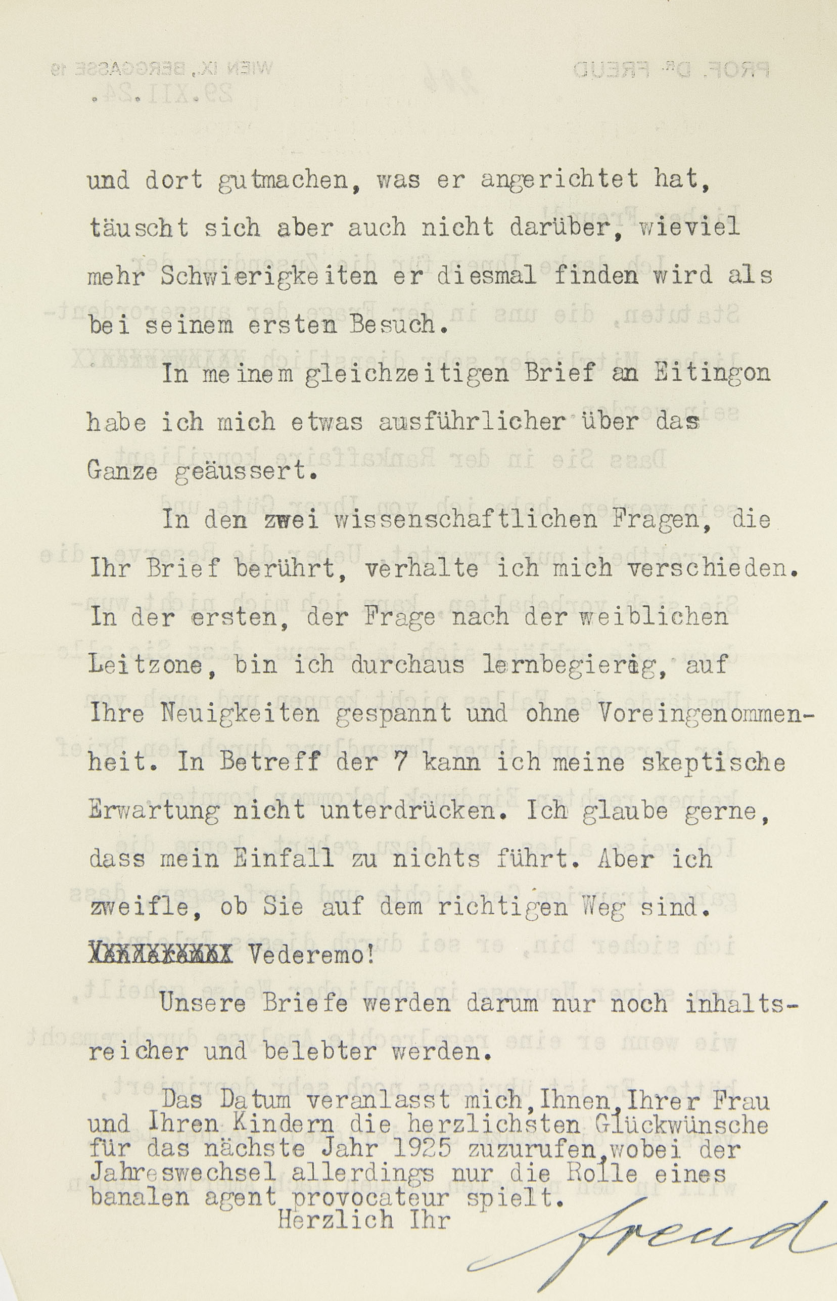 Das Datum veranlaßt mich, Ihnen, Ihrer Frau und Ihren Kindern die herzlichsten Glückwünsche für das nächste Jahr 1925 zuzurufen, wobei der Jahreswechsel allerdings nur die Rolle eines banalen agent provocateur spielt.