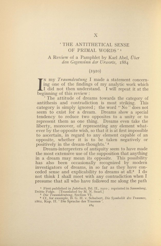 Freud, Sigmund | Searl, Mary Nina | 1910-003/1925 | 10464 | ‘The antithetical sense of primal words’ | CP 4, 1925 | 184–191 | Fertig ✔ | Fertig ✔ | Ganz fertig / zutreffend ✔ | Fehlt ✖ | Fehlt ✖ | Teilweise - | ✔ | EB | ✔ | ||