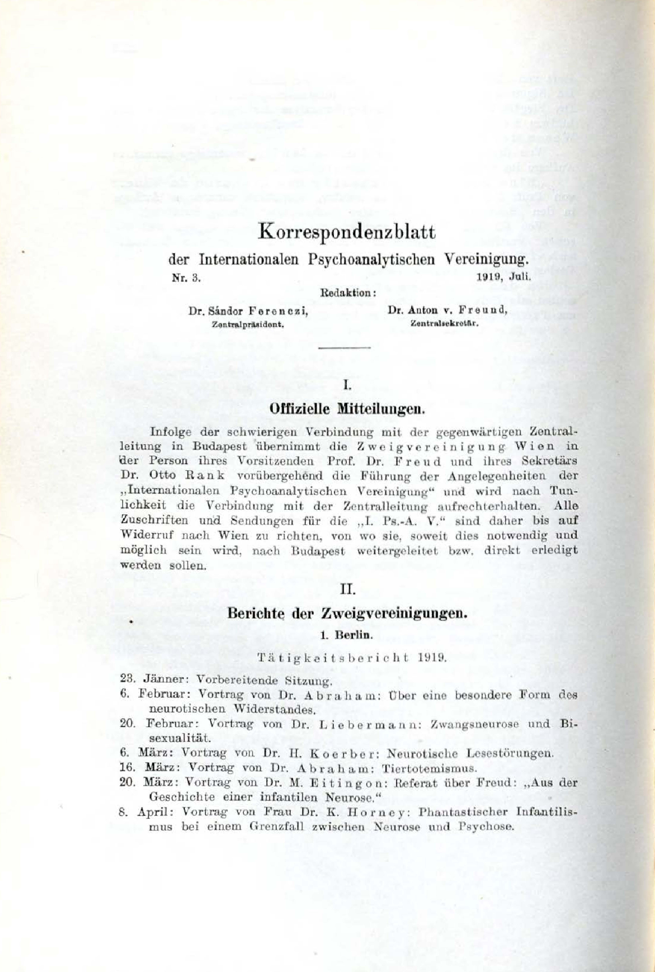 Korrespondenzblatt der Internationalen Psychoanalytischen Vereinigung.