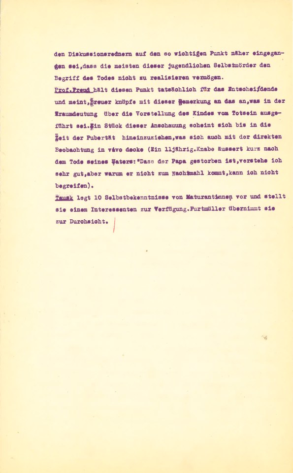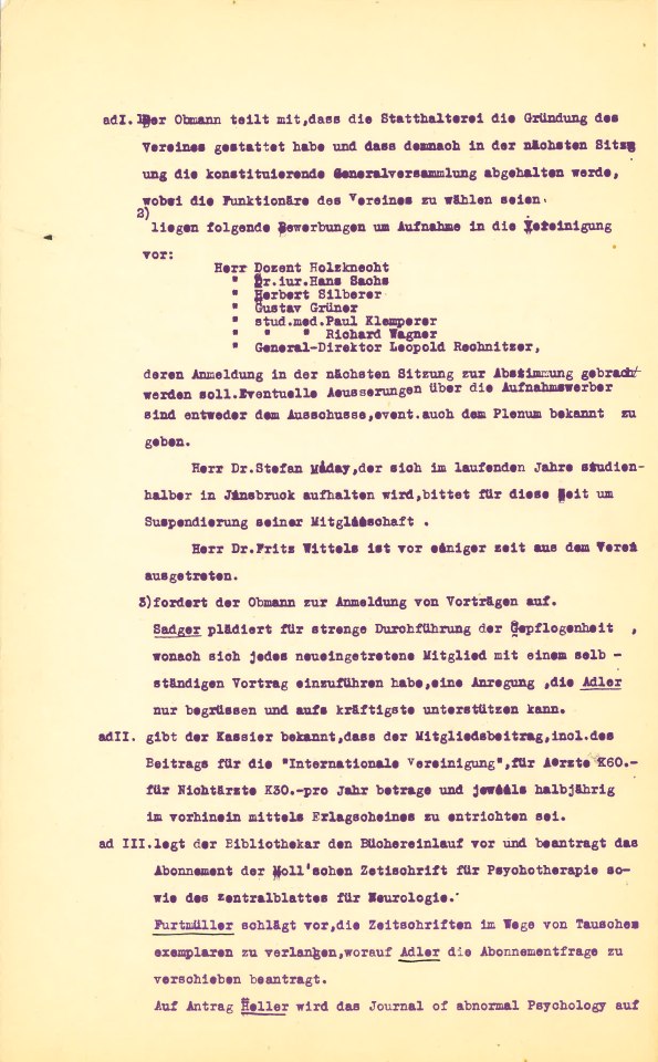 Protokoll der I. Sitzung am 5. Oktober 1910. Vortrag: Zur Psychologie des einzigen und des Lieblingskindes. Referent: Dr. Sadger. Korref. Dr. Friedjung