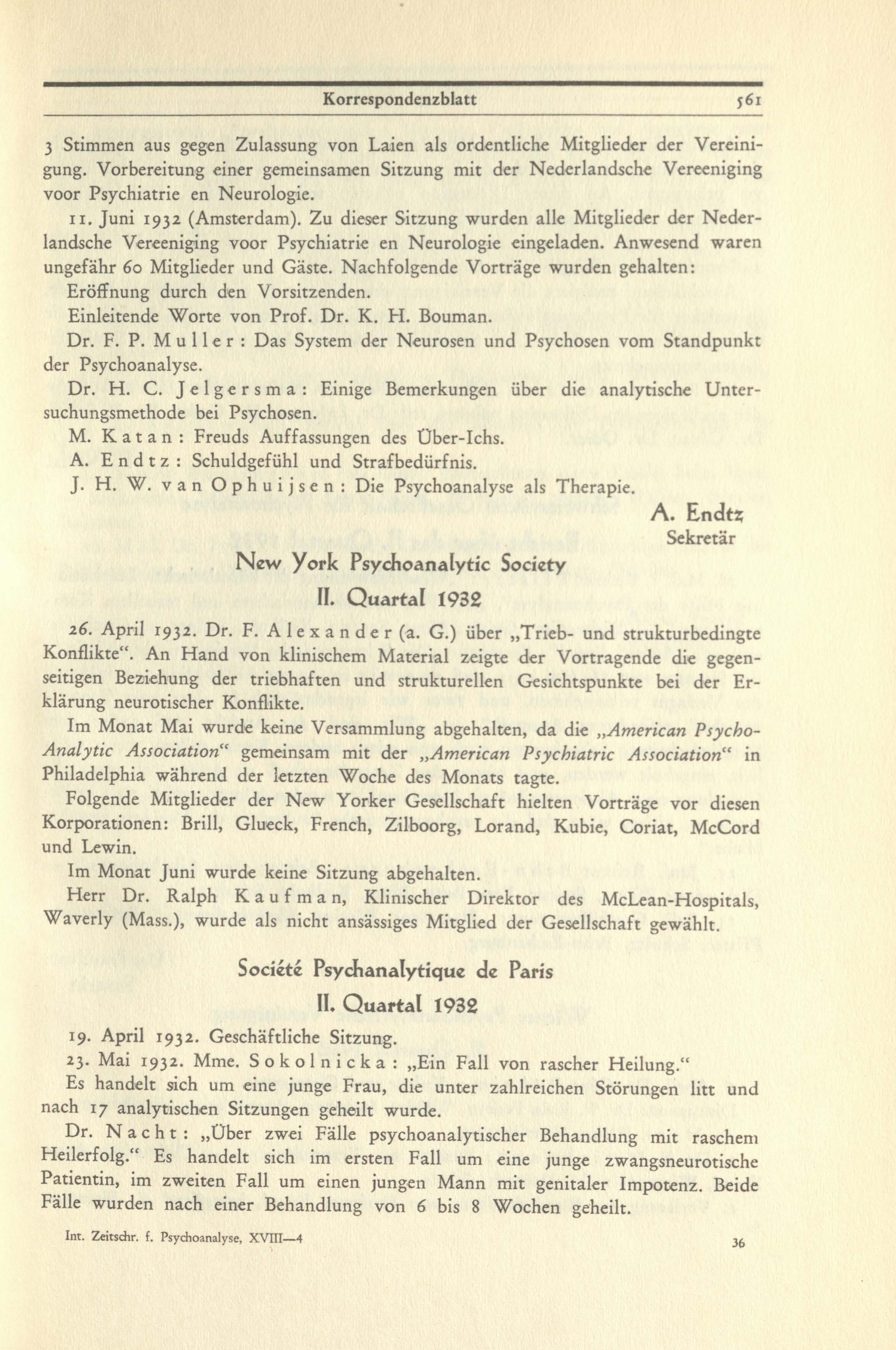 • Nederlandsche Vereenigin voor Psychoanalyse. I. und II. Quartal 1932