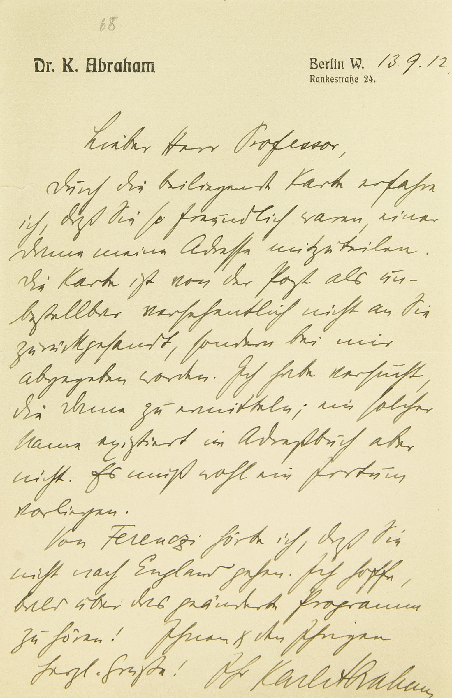 Durch die beiliegende Karte erfahre ich, daß Sie so freundlich waren, einer Dame meine Adresse mitzuteilen. Die Karte ist von der Post als unbestellbar versehentlich nicht an Sie zurückgesandt, sondern bei mir abgegeben worden. Ich habe versucht, die Dame zu ermitteln; ein solcher Name existiert im Adreßbuch aber nicht. Es muß wohl ein Irrtum vorliegen. Von Ferenczi hörte ich, daß Sie nicht nach England gehen. Ich hoffe, bald über das geänderte Programm zu hören! Ihnen und den Ihrigen herzliche Grüße! Ihr Karl Abraham