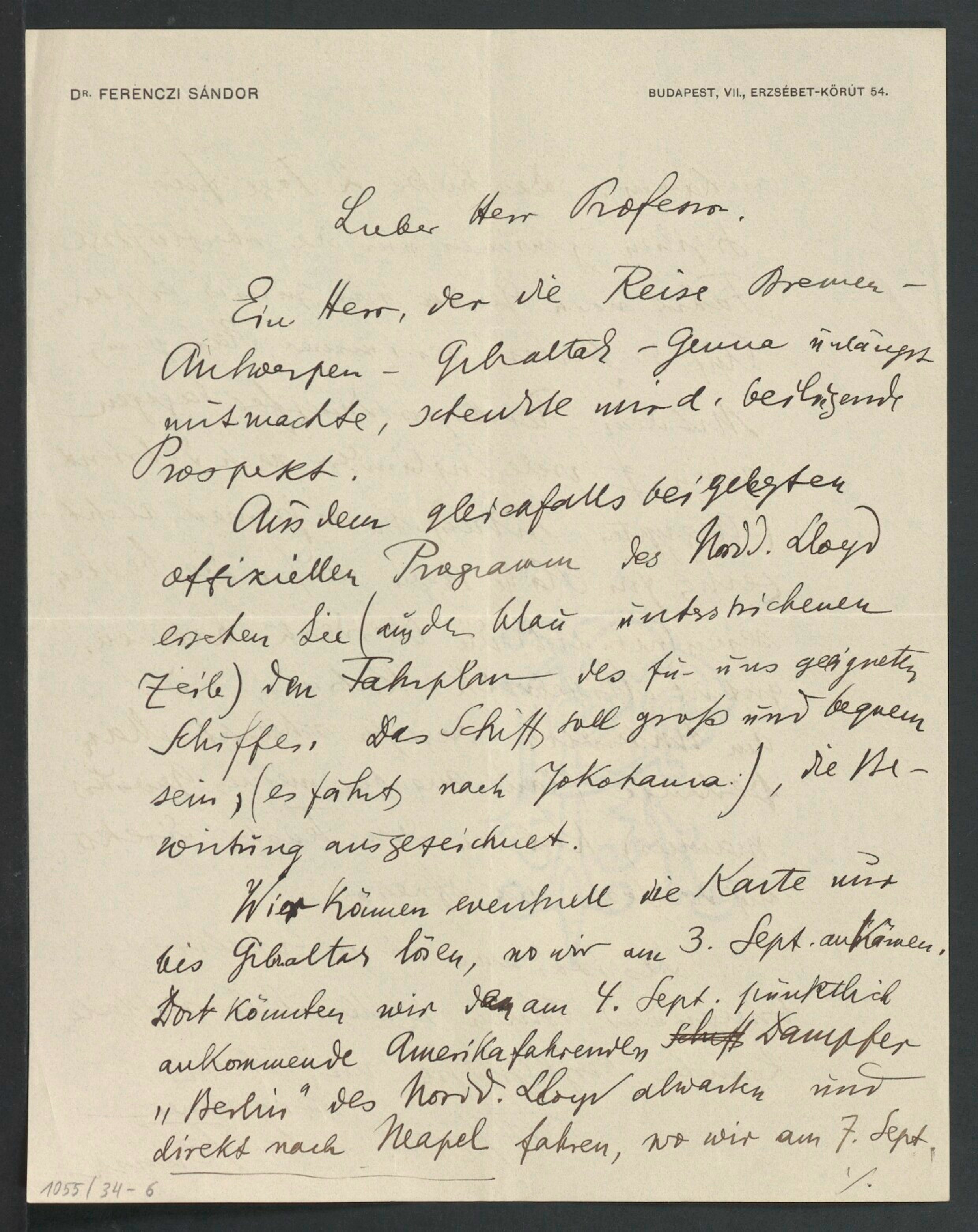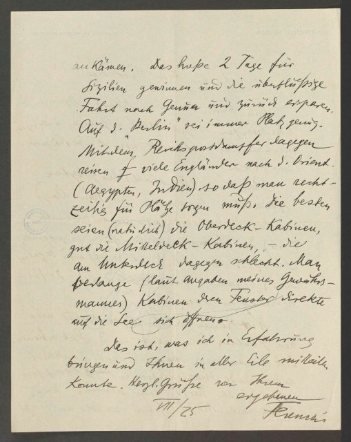 ankämen. Das hieße zwei Tage für Sizilien gewinnen und die überflüssige Fahrt nach Genua und zurück ersparen. Auf der +Berlin* sei immer Platz genug. Mit dem Reichspostdampfer dagegen reisen viele Engländer nach dem Orient (Ägypten, Indien), so daß man rechtzeitig für Plätze sorgen muß. Die besten seien (natürlich) die Oberdeck‑Kabinen, gut die Mitteldeck‑Kabinen ‑ die am Unterdeck dagegen schlecht. Man verlange (laut Angaben meines Gewährsmannes) Kabinen, deren Fenster sich direkte auf die See öffnen.