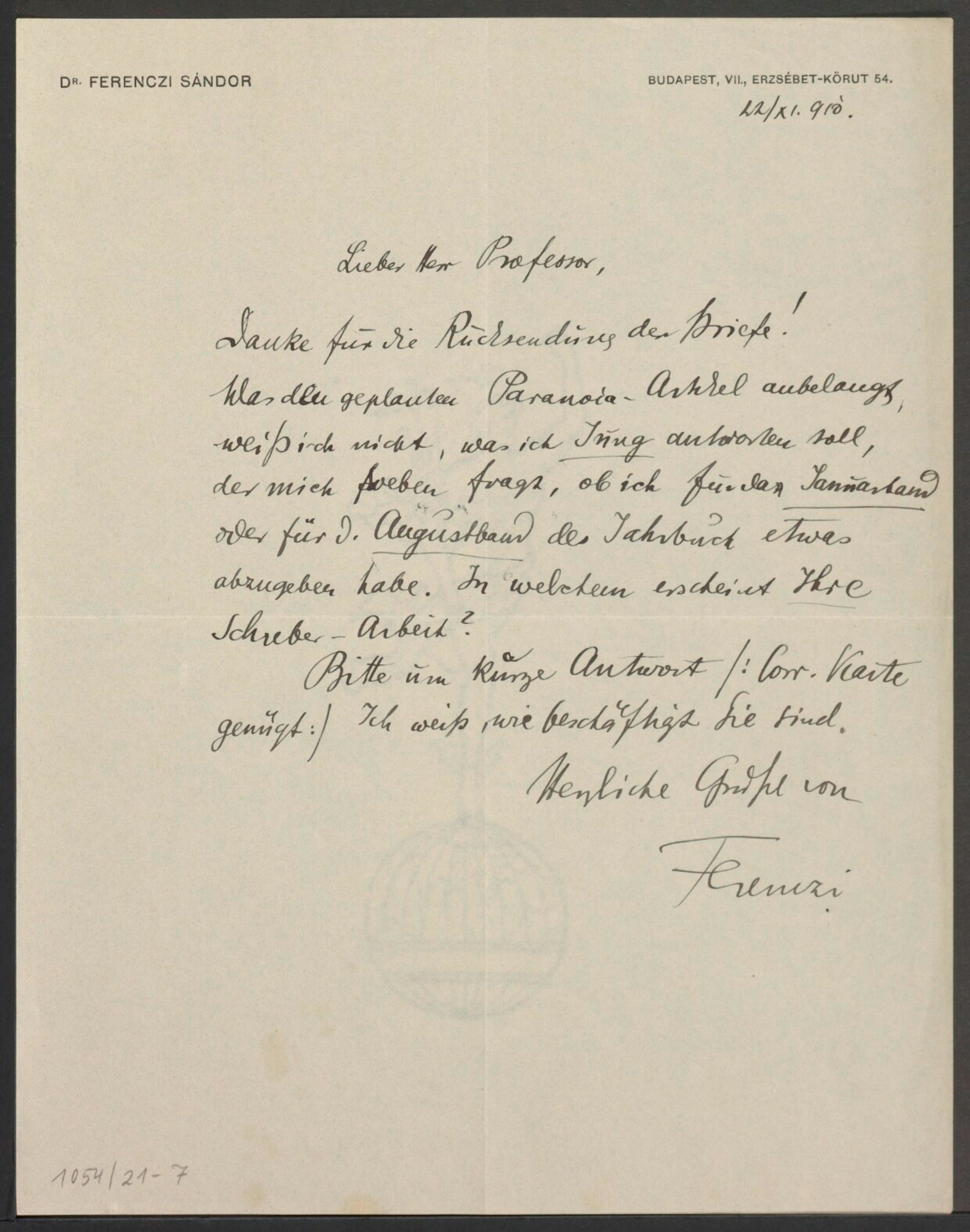 Freud, Sigmund, 1856-1939 [VerfasserIn] ; Ferenczi, Sándor, 1873-1933 [AdressatIn]