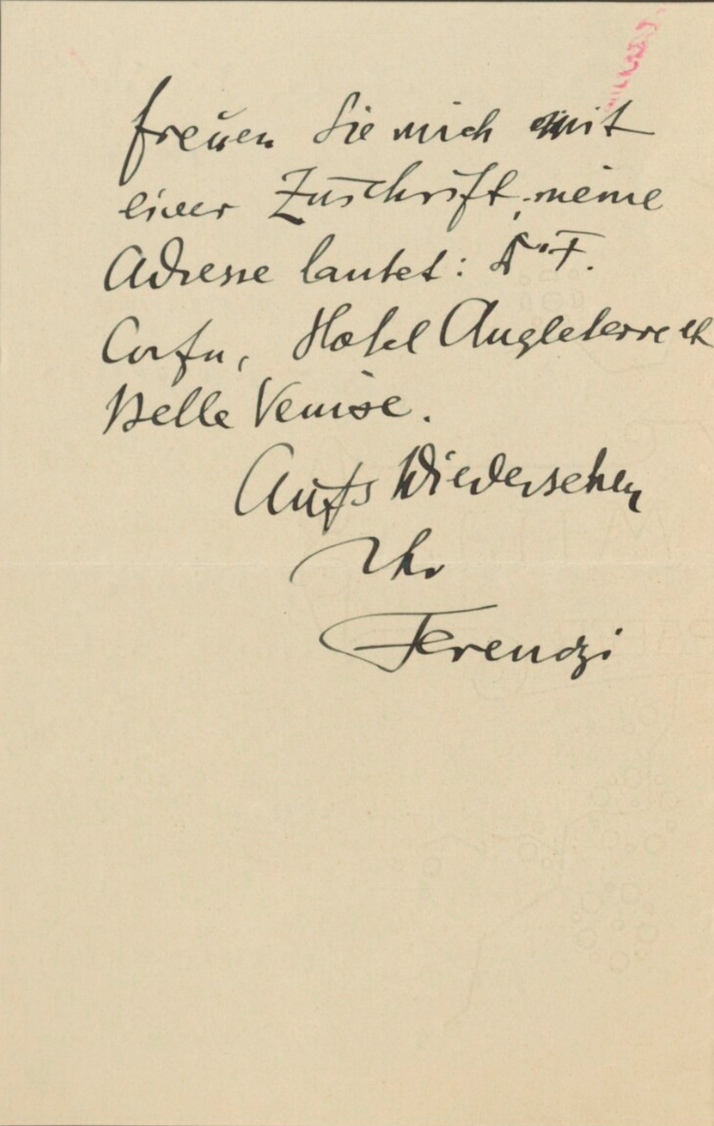 Grüßen Sie mir alle Ihre Lieben, und erfreuen Sie mich mit einer Zuschrift; meine Adresse lautet: Dr. F., Corfu, Hotel Angleterre et Belle Venise.