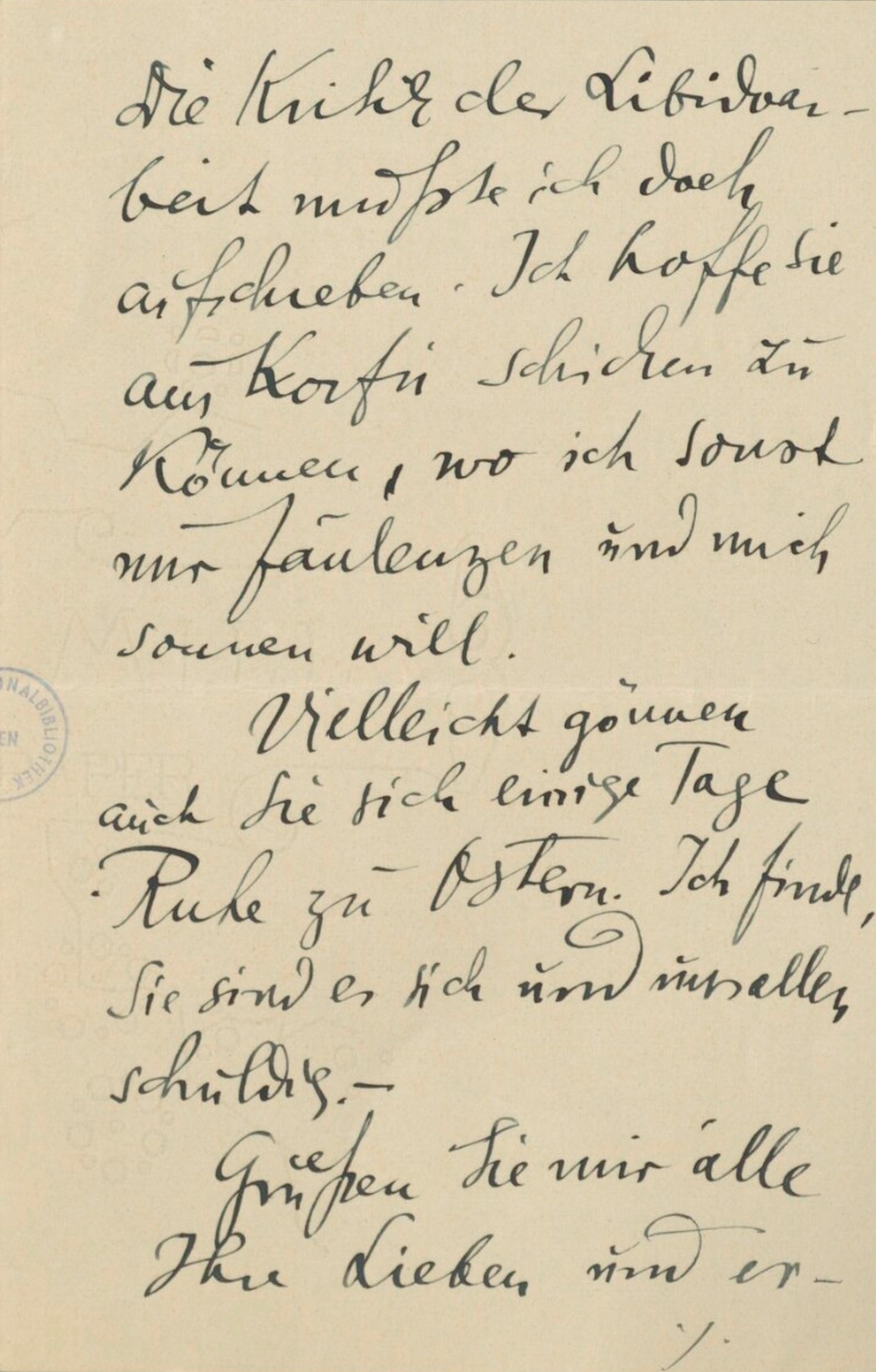 Die Kritik der Libidoarbeit mußte ich doch aufschieben. Ich hoffe sie aus Korfu schicken zu können, wo ich sonst nur faulenzen und mich sonnen will.