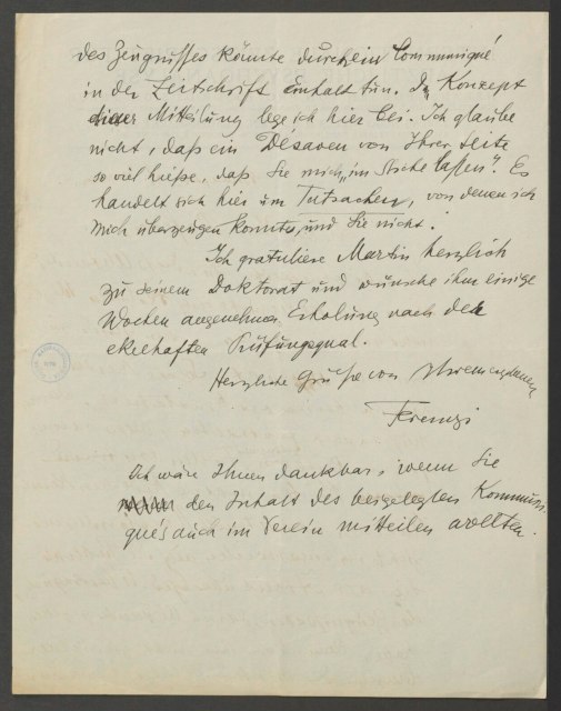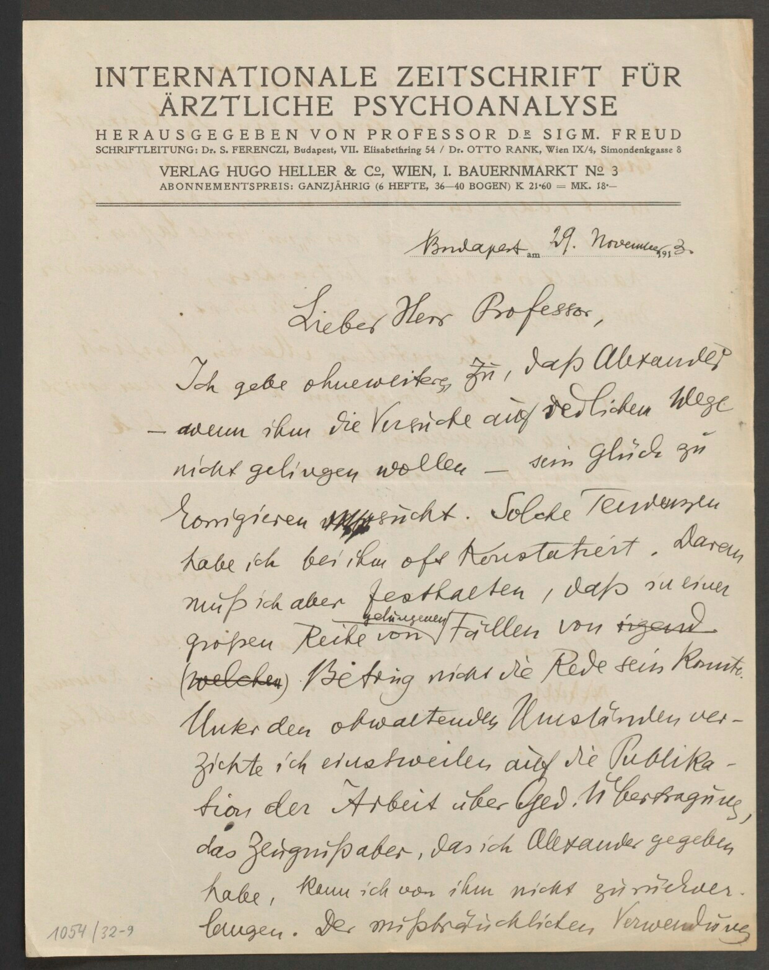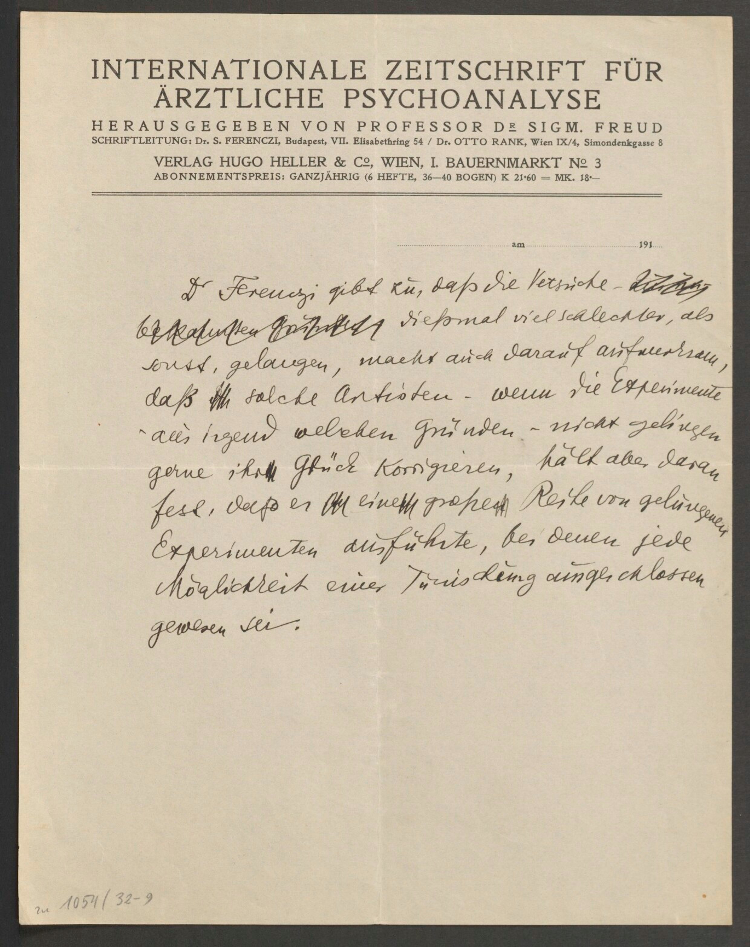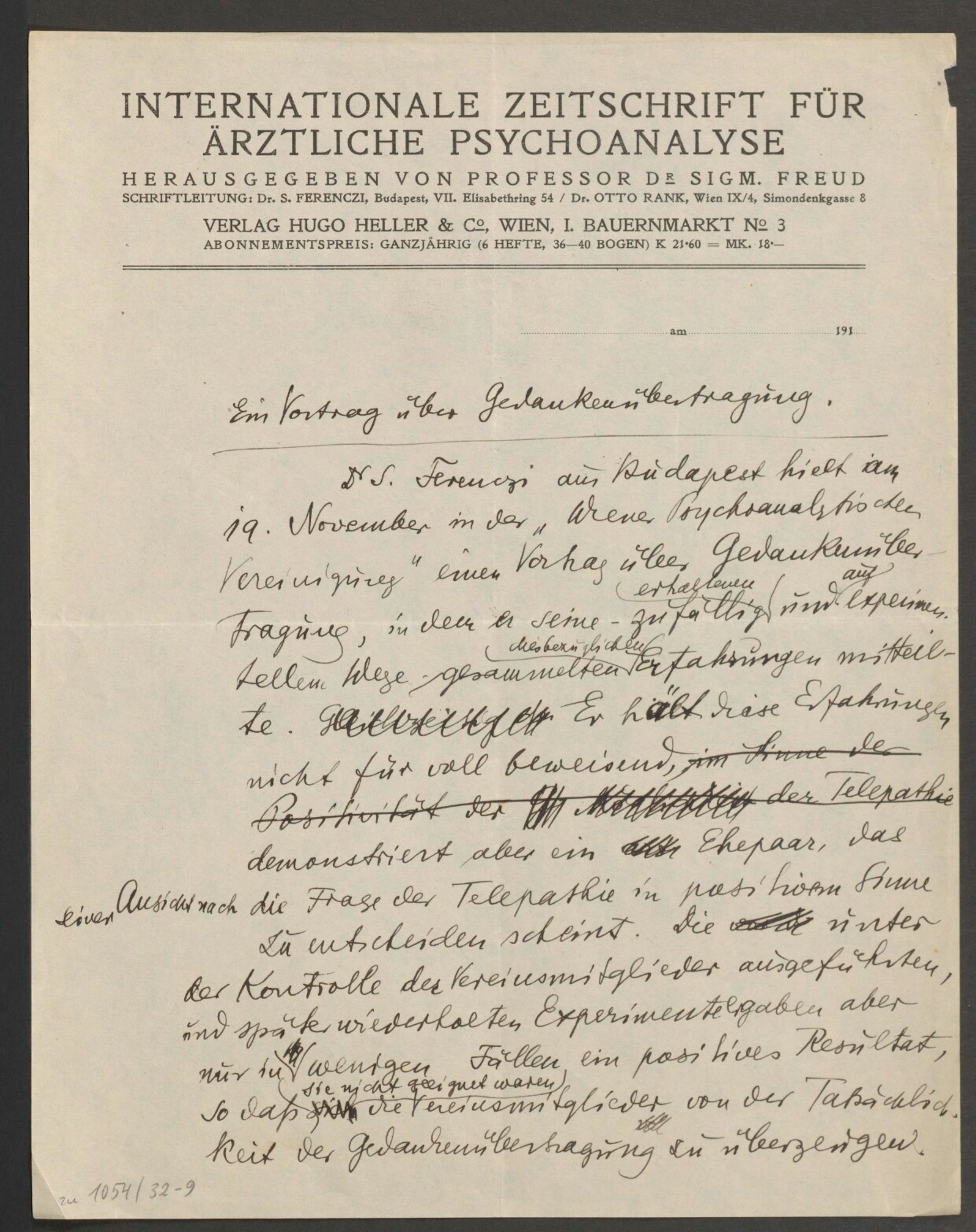 Dr. S. Ferenczi aus Budapest hielt am 19. November in der +Wiener Psychoanalytischen Vereinigung* einen Vortrag über Gedankenübertragung, in dem er seine ‑ zufällig erhaltenen und auf experimentellem Wege gesammelten ‑ diesbezüglichen Erfahrungen mitteilte. Er hält diese Erfahrungen nicht für voll beweisend, demonstriert aber ein Ehepaar, das seiner Ansicht nach die Frage der Telepathie in positivem Sinne zu entscheiden scheint. Die unter der Kontrolle der Vereinsmitglieder ausgeführten und später wiederholten Experimente ergaben aber nur in wenigen Fällen ein positives Resultat, so daß sie nicht geeignet waren, die Vereinsmitglieder von der Tatsächlichkeit der Gedankenübertragung zu überzeugen.