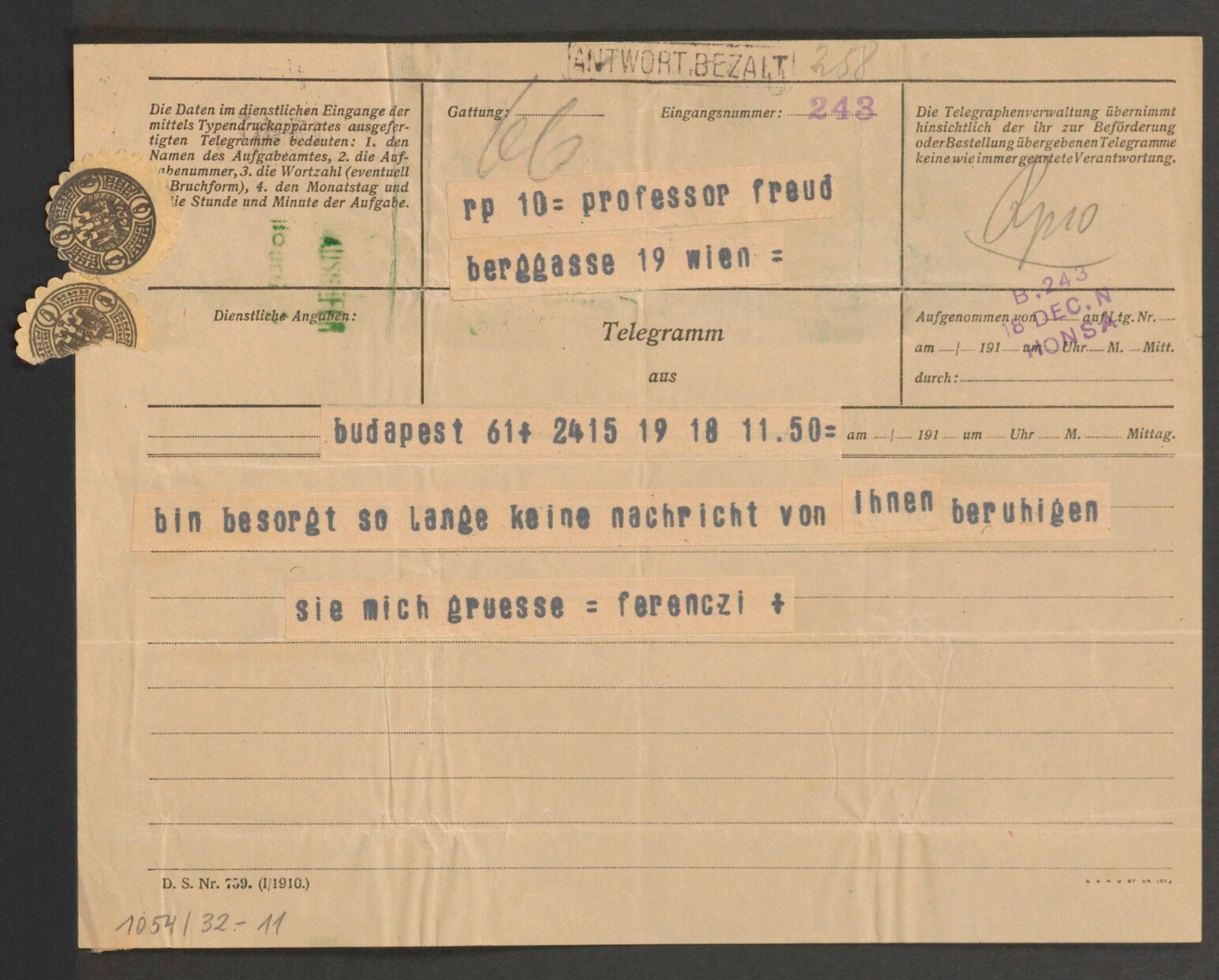 Freud, Sigmund, 1856-1939 [VerfasserIn] ; Ferenczi, Sándor, 1873-1933 [AdressatIn]