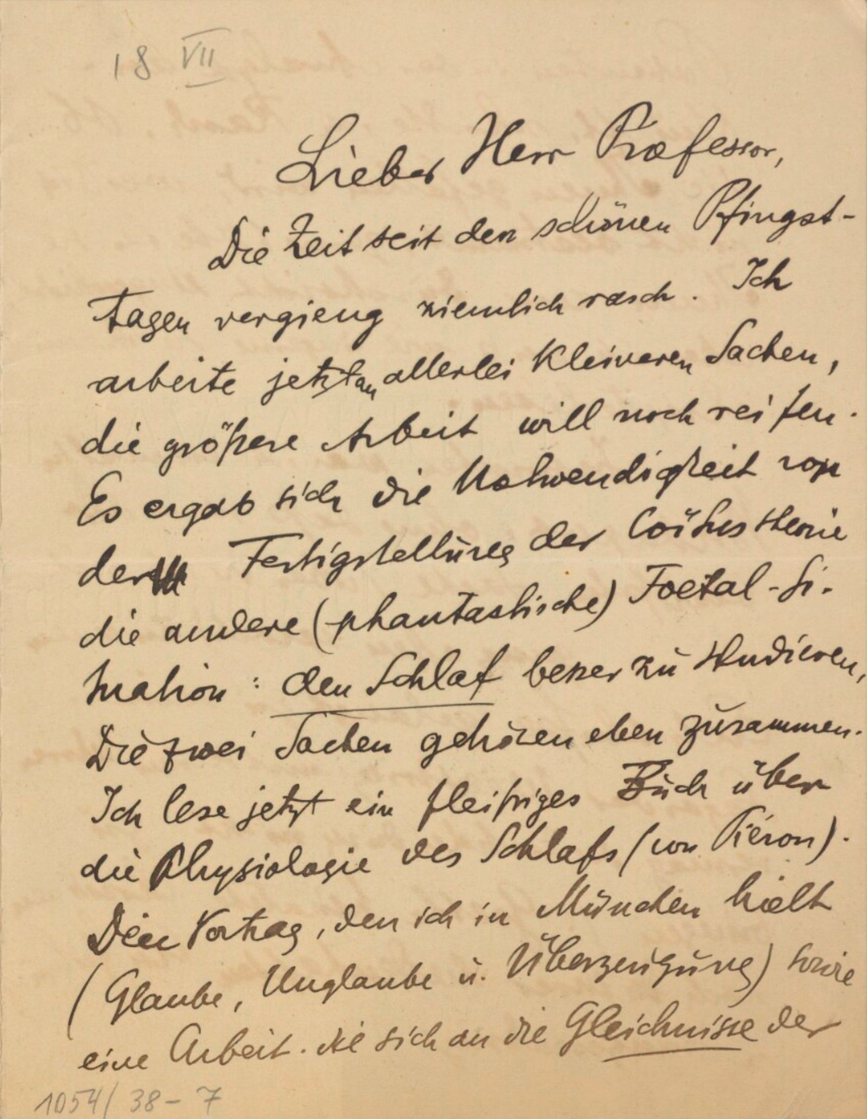 Die Zeit seit den schönen Pfingsttagen verging ziemlich rasch. Ich arbeite jetzt an allerlei kleineren Sachen, die größere Arbeit will noch reifen. Es ergab sich die Notwendigkeit, vor der Fertigstellung der Koitustheorie die andere (phantastische) Fötal‑Situation: den Schlaf, besser zu studieren. Die zwei Sachen gehören eben zusammen. Ich lese jetzt ein fleißiges Buch über die Physiologie des Schlafs (von Piéron)1. Den Vortrag, den ich in München hielt (Glaube, Unglaube und Überzeugung), sowie eine Arbeit, die sich an die Gleichnisse der Patienten in der Analyse anknüpft2, schickte ich Rank. Ob sie Ihnen gefallen wird, weiß ich nicht bestimmt; gerne hätte ich sie Ihnen zur Durchsicht eingeschickt, aber ich weiß, wie ungerne Sie Manuskripte lesen.
