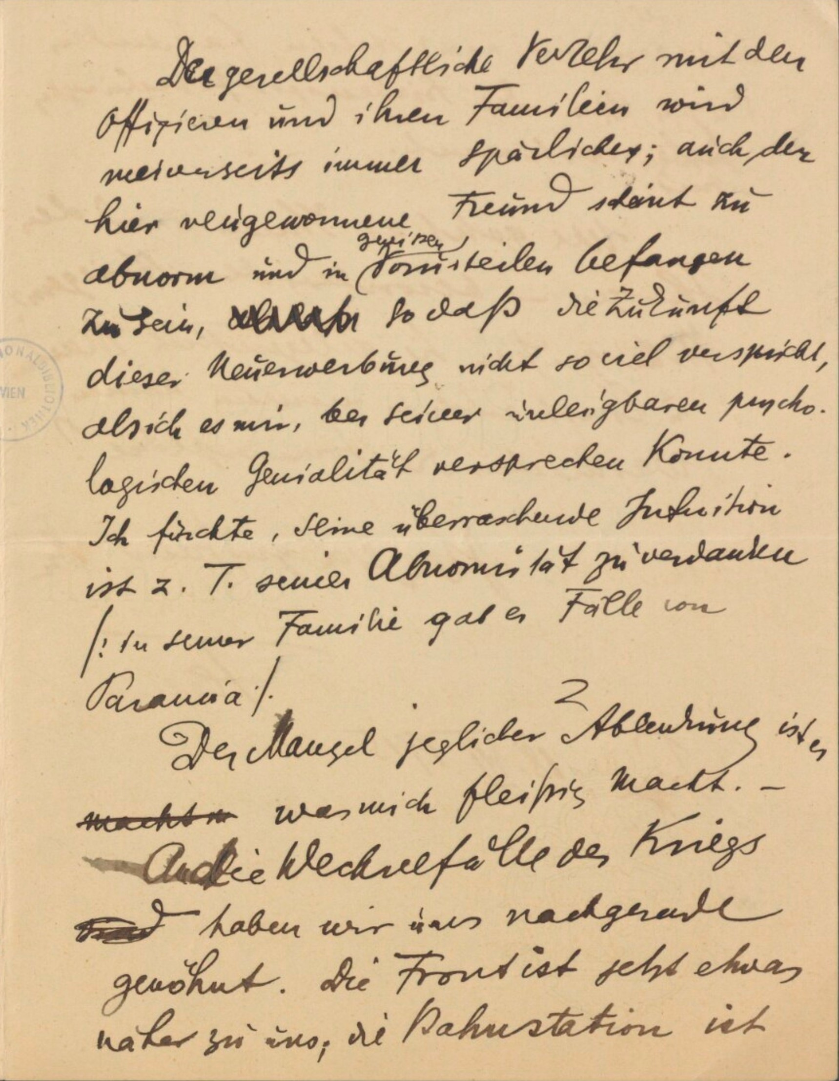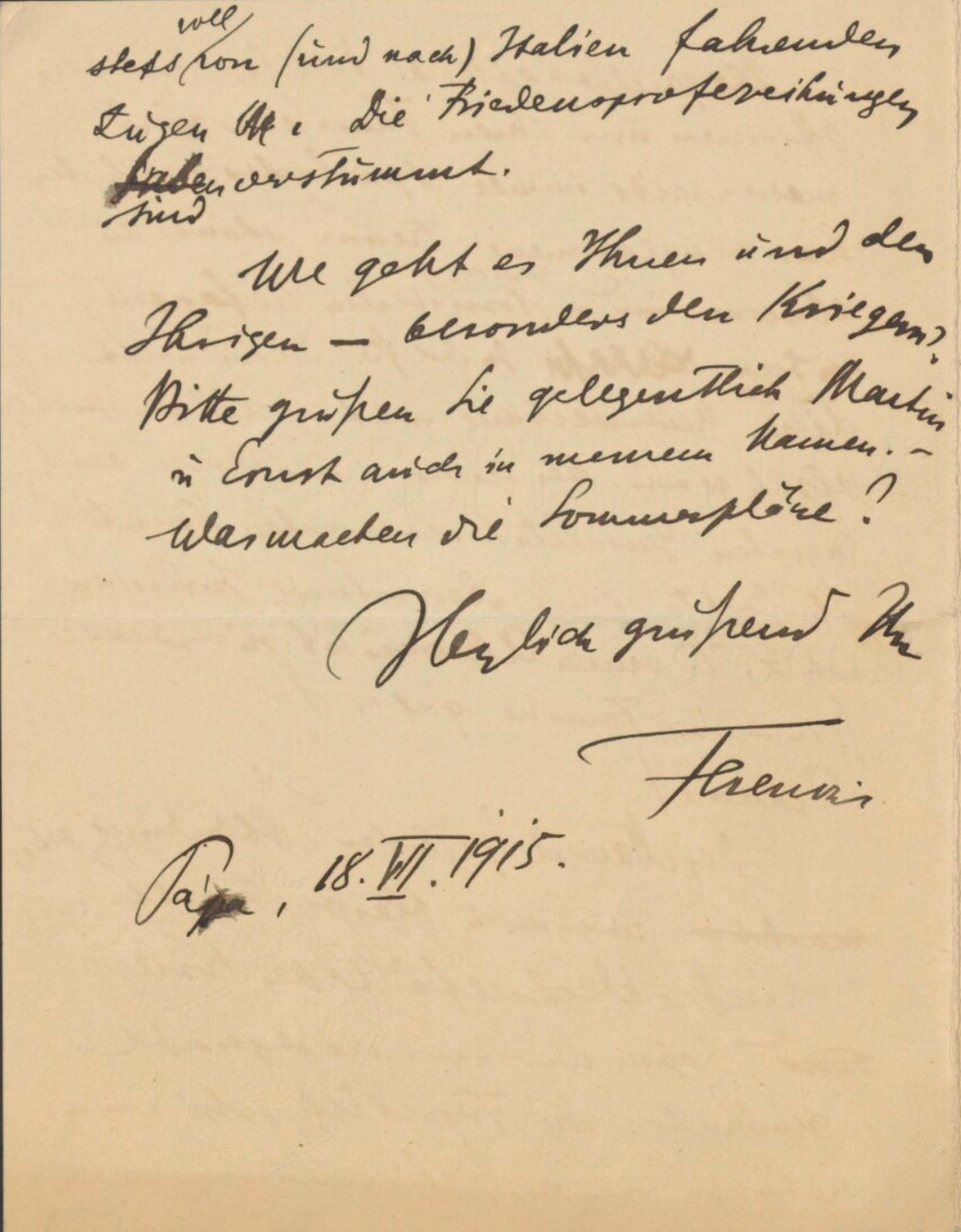 Der Mangel jeglicher Ablenkung ist es, was mich fleißig macht. ‑ An die Wechselfälle des Kriegs haben wir uns nachgerade gewöhnt. Die Front ist jetzt etwas näher zu uns; die Bahnstation ist stets voll [von] von (und nach) Italien fahrenden Zügen. Die Friedensprophezeiungen sind verstummt.