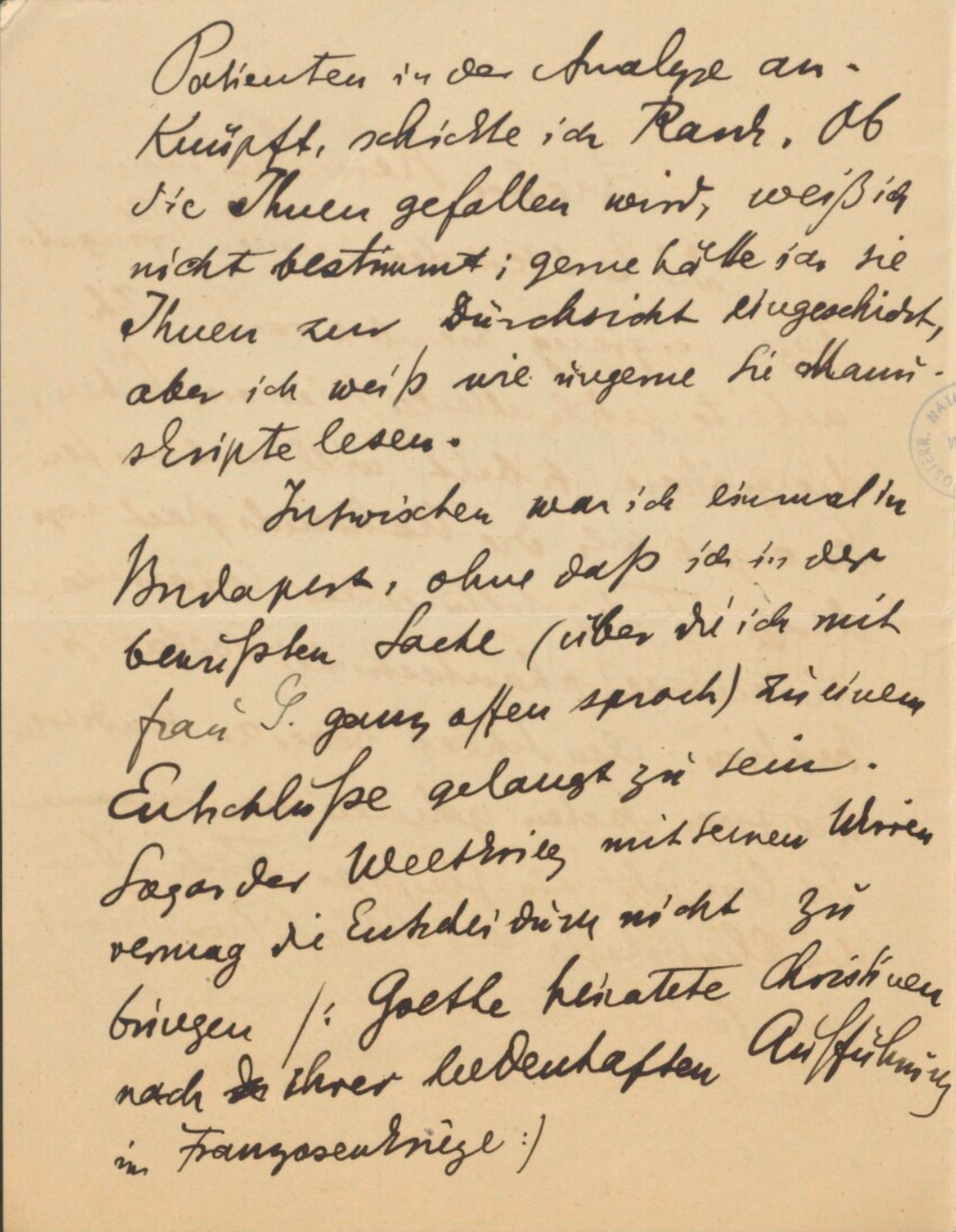 Inzwischen war ich einmal in Budapest, ohneB in der bewußten Sache3 (über die ich mit Frau G. ganz offen sprach) zu einem Entschlusse gelangt zu sein. Sogar der Weltkrieg mit seinen Wirren vermag die Entscheidung nicht zu bringen (Goethe heiratete Christinen nach ihrer heldenhaften Aufführung im Franzosenkriege4).