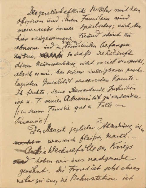 Der gesellschaftliche Verkehr mit den Offizieren und ihren Familien wird meinerseits immer spärlicher; auch der hier neugewonnene Freund5 scheint zu abnorm und in gewissen Vorurteilen befangen zu sein, so daß die Zukunft dieser Neuerwerbung nicht so viel verspricht, als ich es mir bei seiner unleugbaren psychologischen Genialität versprechen konnte. Ich fürchte, seine überraschende Intuition ist zum Teil seiner Abnormität zu verdanken (in seiner Familie gab es Fälle von Paranoia).
