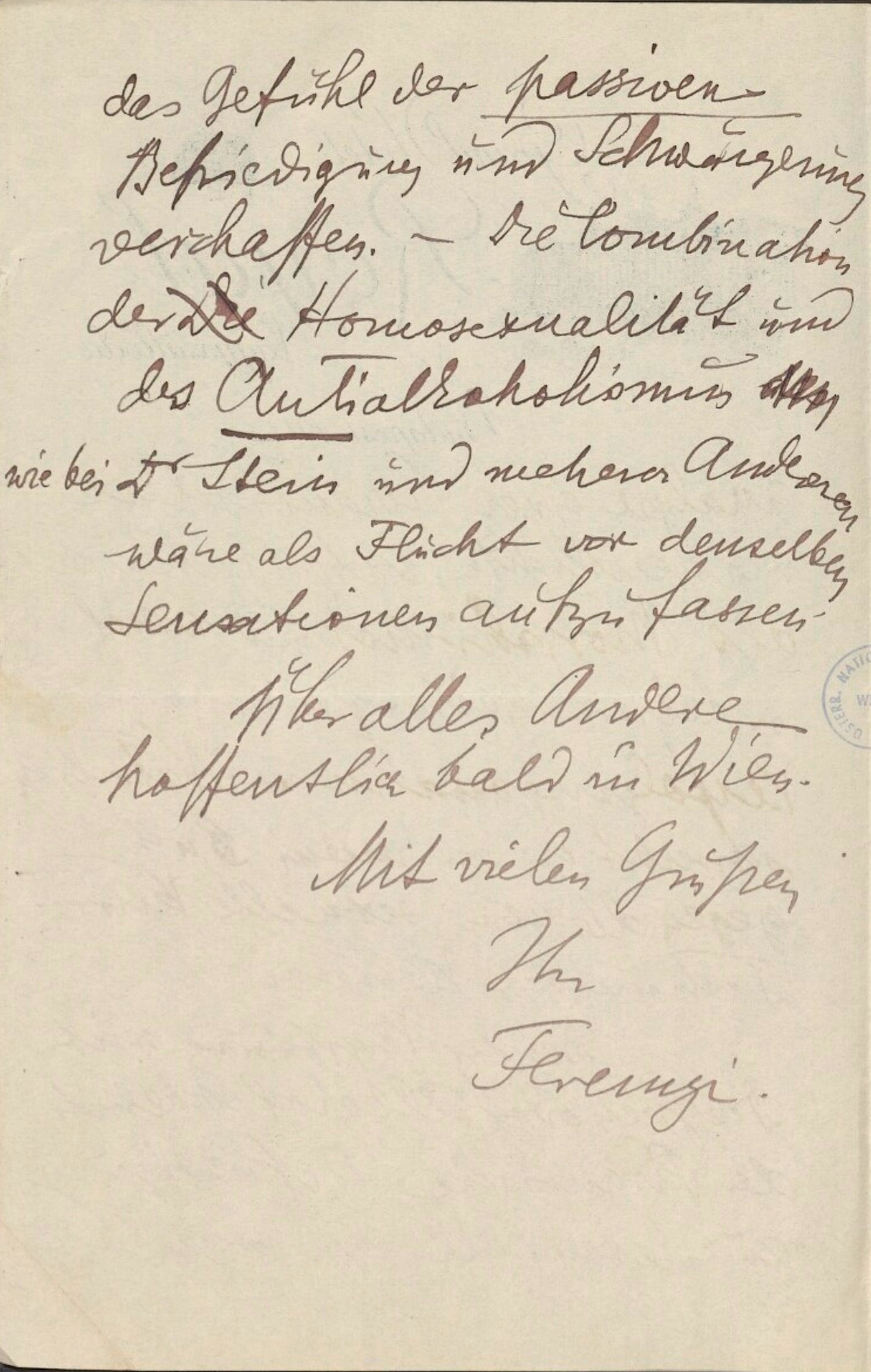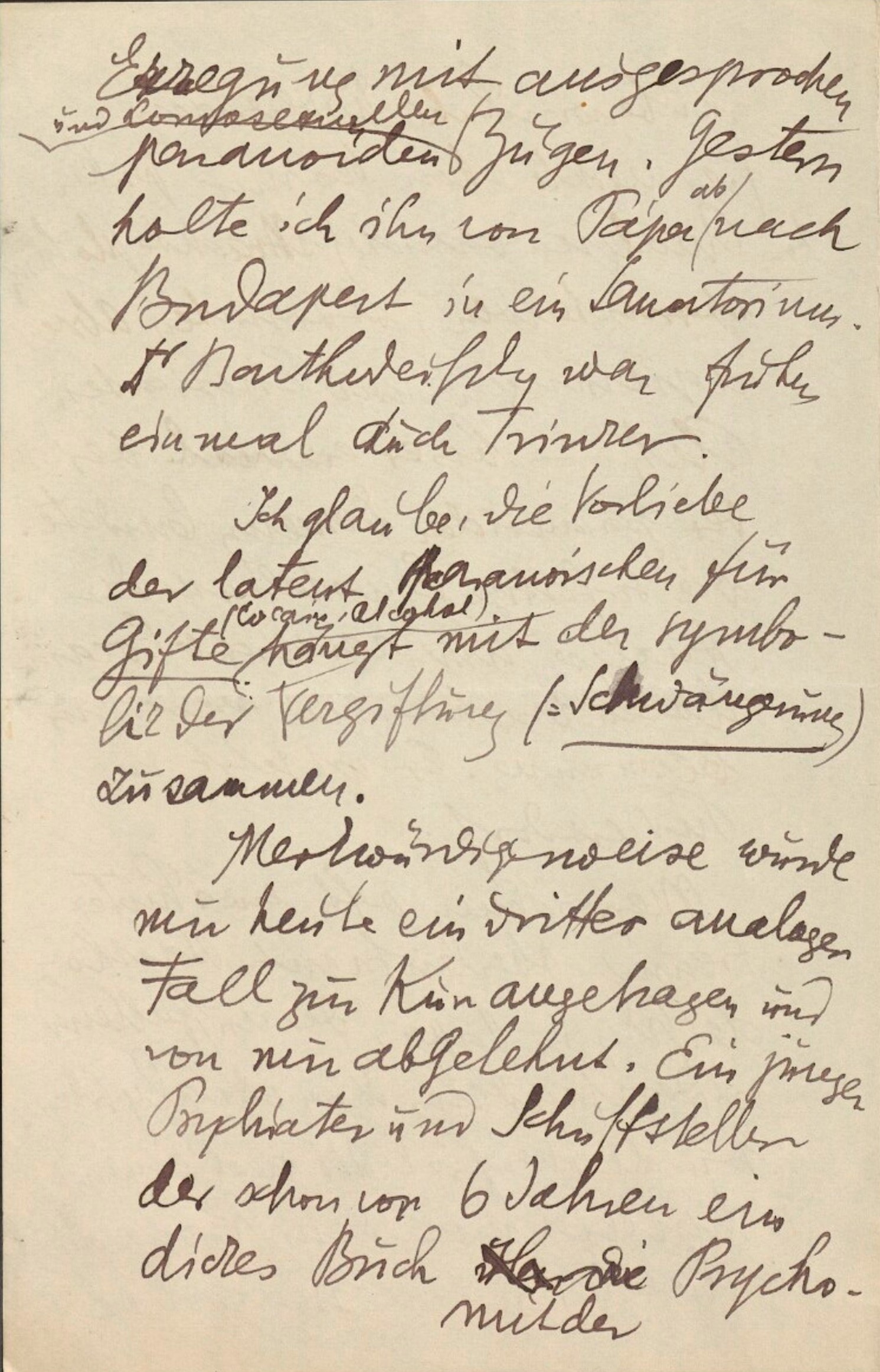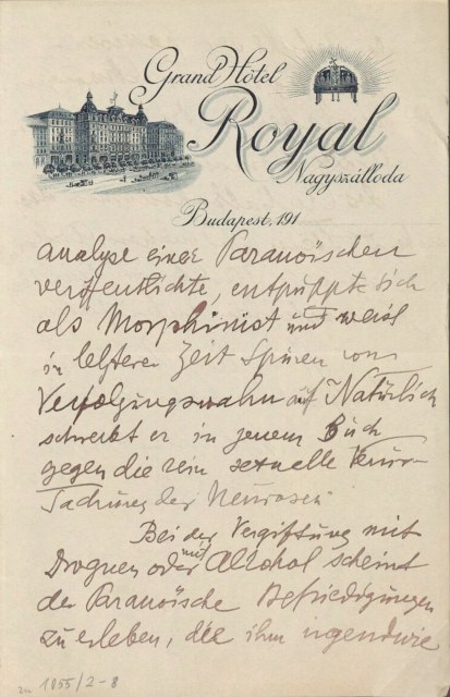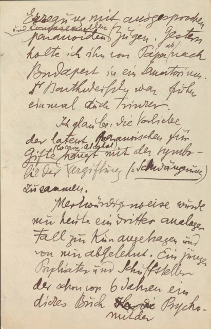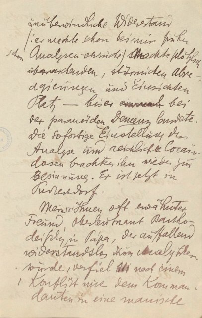 Von zwei erschütternden Ereignissen muß ich aber berichten, beide aus der eigenen Praxis. ‑ Ein Patient, Arzt, Kokainist, begann die Kur gleichzeitig mit der Entwöhnung. Der früher unüberwindliche Widerstand (er machte bei mir früher schonB Analysenversuche) machte plötzlich überraschenden, stürmischen Abreagierungen und Einsichten Platz ─ bis er bei der paranoiden Demenz landete. Die sofortige Einstellung der Analyse und reichliche Kokaindosen brachten ihn wieder zur Besinnung. Er ist jetzt in Purkersdorf33.