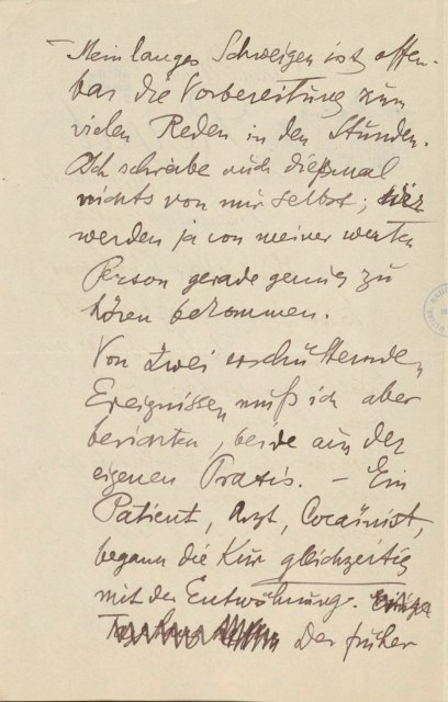 Es ist fast ausgemacht (der Sanitätschef hat es mir selbst versprochen), daß ich vom 15. Juni angefangen einen dreiwöchigen Urlaub bekomme. Ich möchte ─ wie schon geschrieben ─ diese Zeit in Ihrer Behandlung verbringen und bitte um die Reservierung zweier Stunden täglich. Mein langes Schweigen ist offenbar die Vorbereitung zum vielen Reden in den Stunden. Ich schreibe auch diesmal nichts von mir selbst; wir werden ja von meiner werten Person gerade genug zu hören bekommen.
