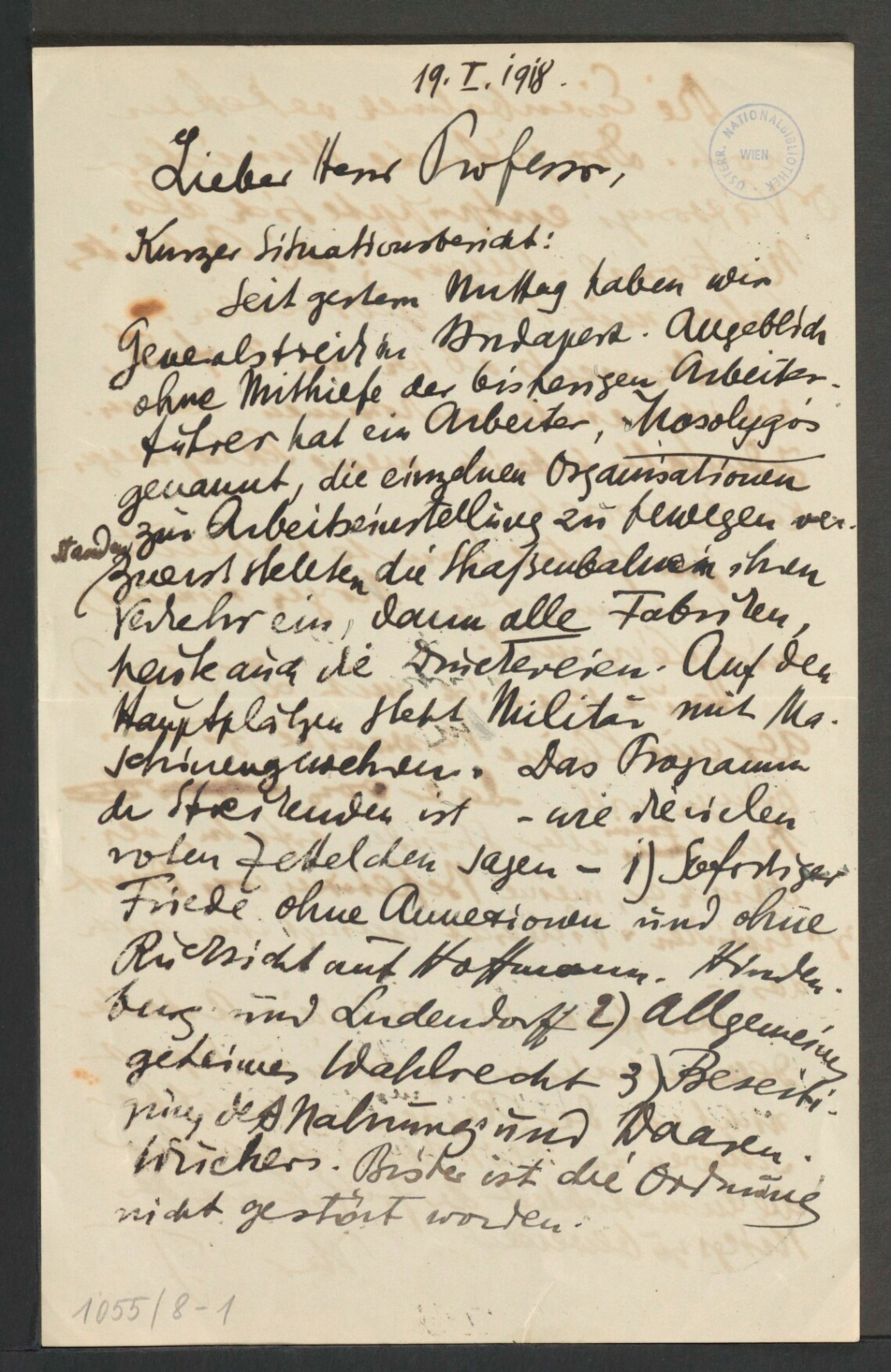 Seit gestern mittag haben wir Generalstreik in Budapest.[1] Angeblich ohne Mithilfe der bisherigen Arbeiterführer hat ein Arbeiter, Mosolygós[2] genannt, die einzelnen Organisationen zur Arbeitseinstellung zu bewegen verstanden. Zuerst stellten die Straßenbahnen ihren Verkehr ein, dann alle Fabriken, heute auch die Druckereien. Auf den Hauptplätzen steht Militär mit Maschinengewehren. Das Programm der Streikenden ist wie die vielen roten Zettelchen sagen 1) sofortiger Friede ohne Annexionen und ohne Rücksicht auf Hoffmann[3], Hindenburg und Ludendorff; 2) allgemeines geheimes Wahlrecht; 3) Beseitigung des Nahrungs‑ und Warenwuchers. Bisher ist die Ordnung nicht gestört worden.