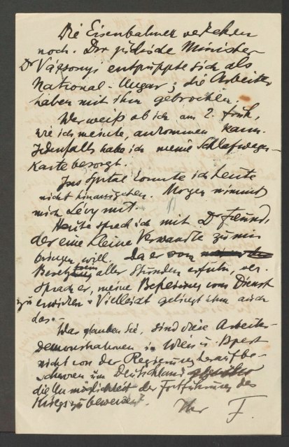 Die Eisenbahnen verkehren noch. Der jüdische Minister Dr. Vázsonyi[4] entpuppte sich als National‑Ungar; die Arbeiter haben mit ihm gebrochen.