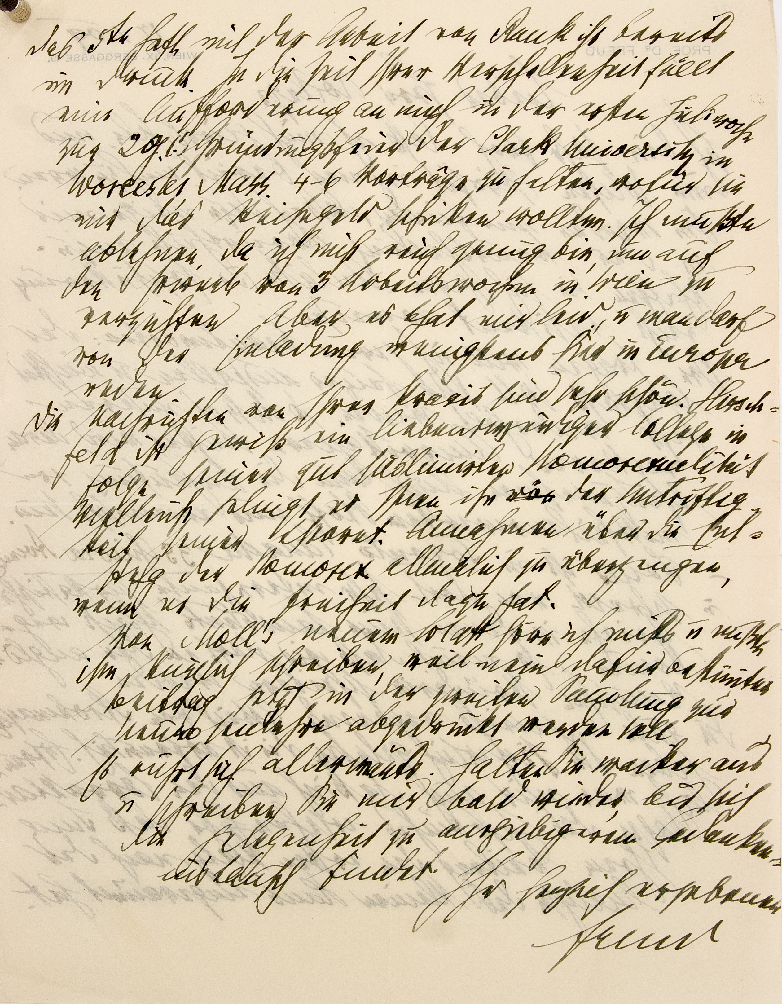 Das 5. Heft mit der Arbeit von Rank ist bereits in Druck. In die Zeit Ihrer Verschollenheit fällt eine Aufforderung an mich, in der ersten Juliwoche zur 20j.(!) Gründungsfeier der Clark University in Wor-cester, Mass. 4-6 Vorträge zu halten, wofür sie mir das Reisegeld schicken wollten. Ich mußte ablehnen, da ich nicht reich genug bin, um auf den Erwerb von 3 Arbeitswochen in Wien zu verzichten. Aber es tat mir leid, und man darf von der Einladung wenigstens hier in Europa reden.