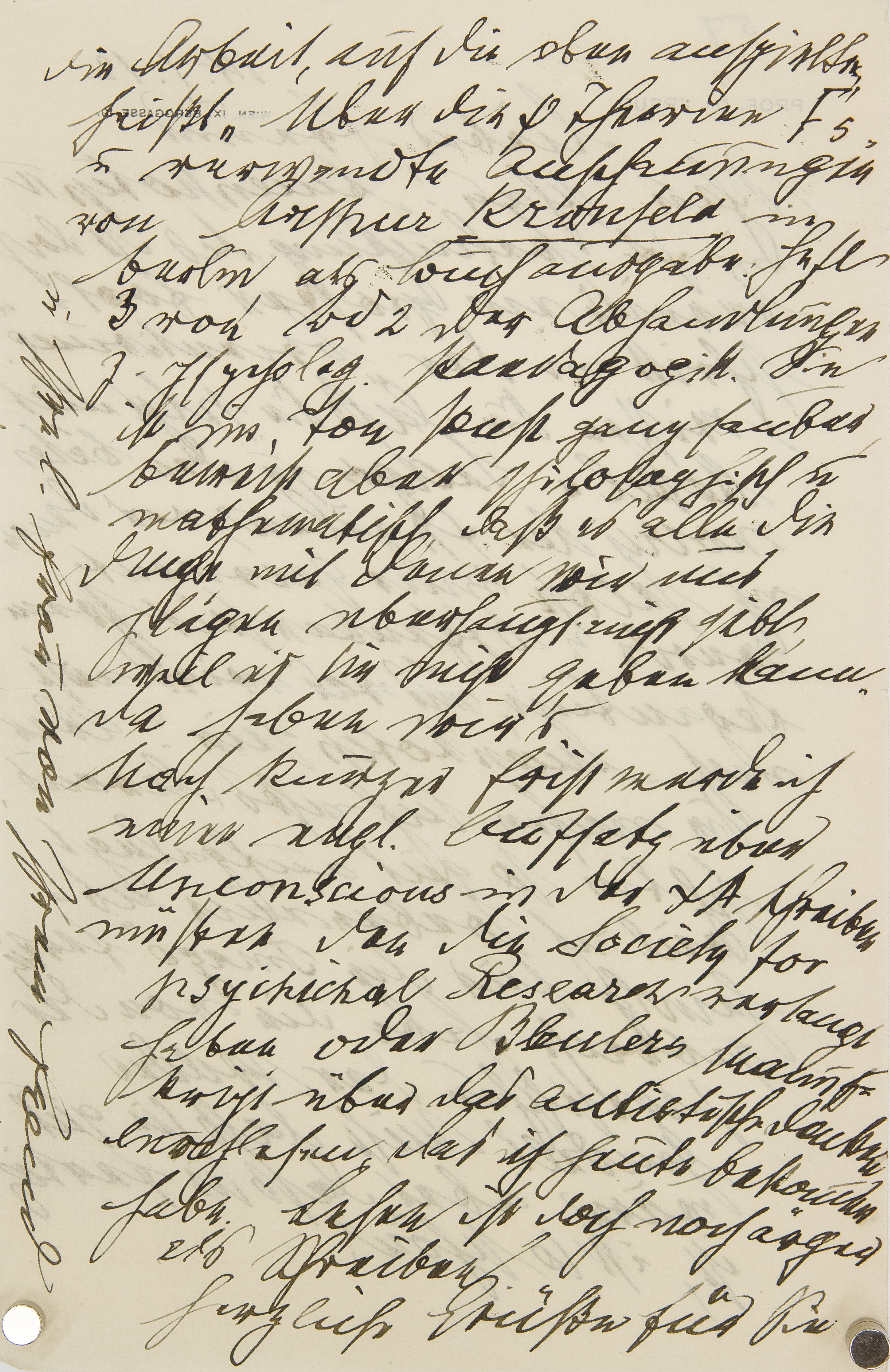 Nach kurzer Frist werde ich einen englischen Aufsatz über Unconscious in der Psychoanalyse schreiben müssen, den die Society for Psychical Research verlangt haben, oder Bleulers Manuskript über das autistische Denken durchlesen, das ich heute bekommen habe. Lesen ist doch noch ärger als schreiben.
