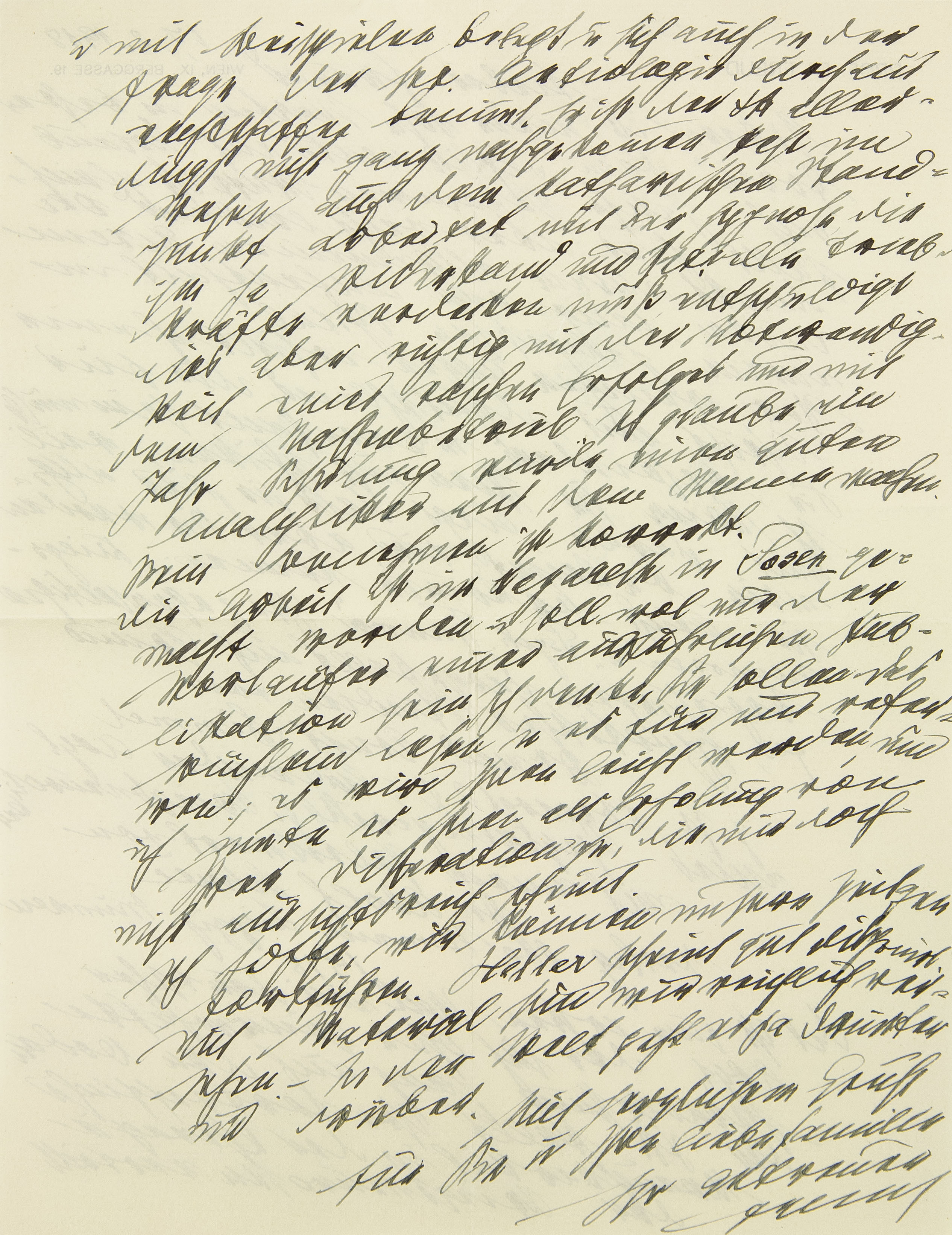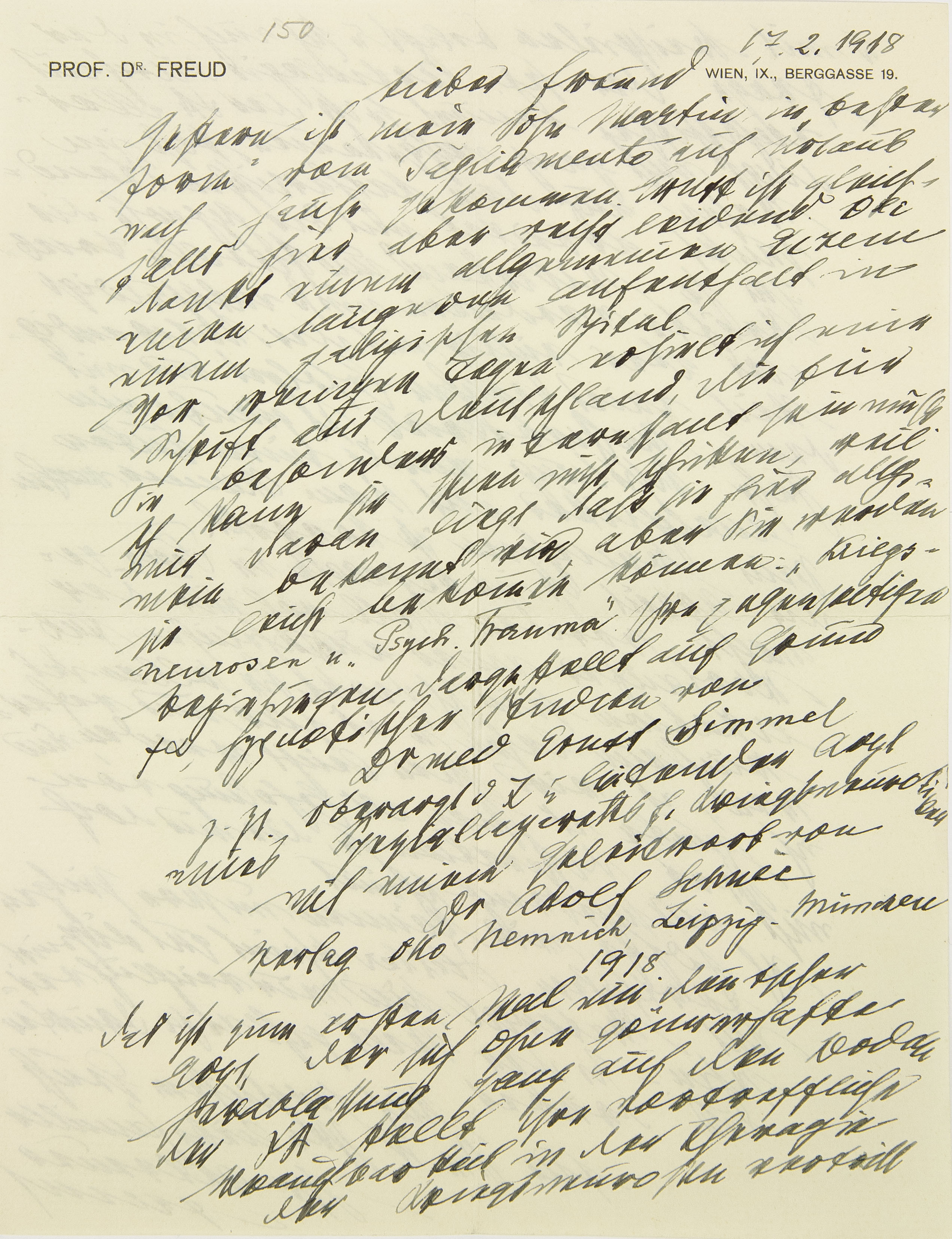 [Briefkopf Wien] 17. 2. 1918 Lieber Freund Gestern ist mein Sohn Martin in »bester Form« vom Tagliamento auf Urlaub nach Hause gekommen. Ernst ist gleichfalls hier, aber recht leidend. Oli dankt einem allgemeinen Ekzem einen längeren Aufenthalt in einem galizischen Spital. Vor wenigen Tagen erhielt ich eine Schrift aus Deutschland, die für Sie besonders interessant sein muß. Ich kann sie Ihnen nicht schicken, weil mir daran liegt, daß sie hier allgemein be- kannt wird, aber Sie werden sie leicht bekommen können: »Kriegsneurosen und Psychisches Trauma«. Ihre gegenseitigen Beziehungen dargestellt auf Grund psychoanalytischer, hypnotischer Studien von Drmed Ernst Simmel z.Zt. Oberarzt d. L. und leitender Arzt eines Speziallazaretts für Kriegsneurotiker Mit einem Geleitwort von DrAdolf Schnee Verlag Otto Nemnich, Leipzig – München 1918. Das ist zum ersten Mal ein deutscher Arzt, der sich ohne gönnerhafte Herablassung ganz auf den Boden der Psychoanalyse stellt, ihre vortreffliche Brauchbarkeit in der Therapie der Kriegsneurosen vertritt