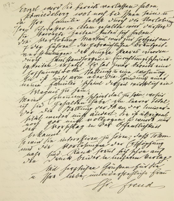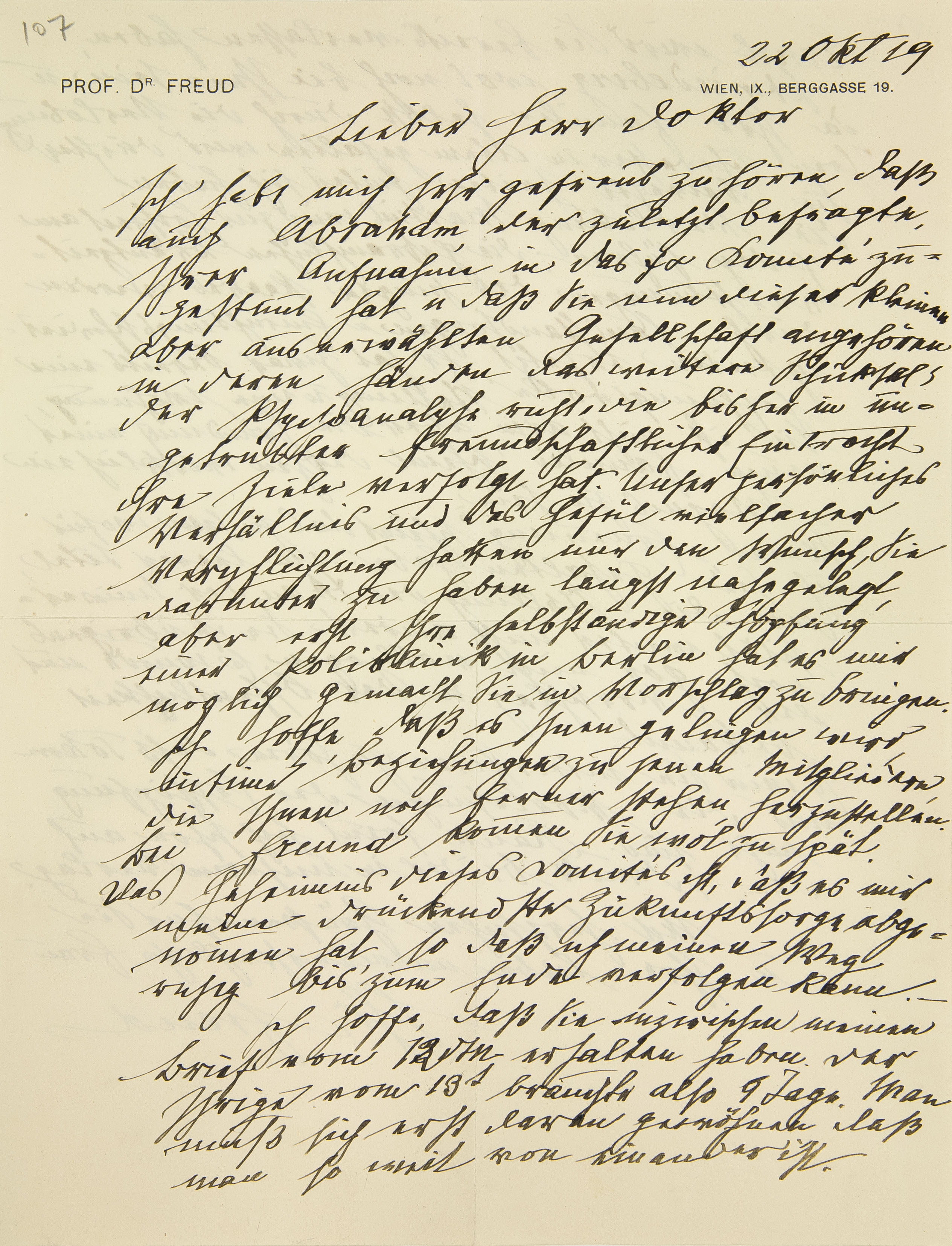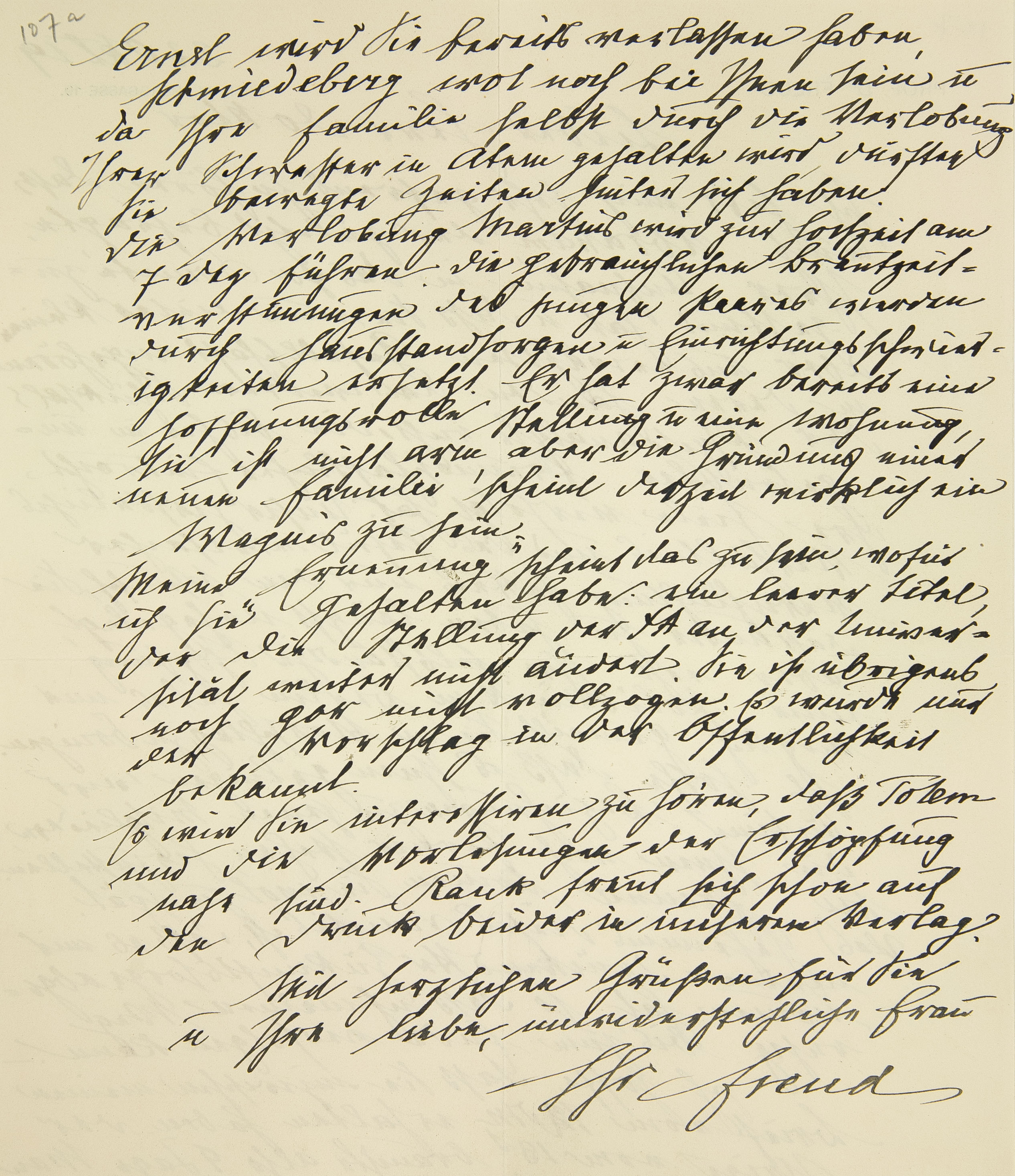 Ich habe mich sehr gefreut zu hören, daß auch Abraham, der zuletzt Befragte, Ihrer Aufnahme in das psychoanalytische Komiteea zugestimmt hat und daß Sie nun dieser kleinen, aber auserwählten Gesellschaft angehören, in deren Händen das weitere Schicksal der Psychoanalyse ruht, die bisher in ungetrübter freundschaftlicher Eintracht ihre Ziele verfolgt hat. Unser persönliches Verhältnis und das Gefühl vielfacher Verpflichtung hatten mir den Wunsch, Sie darunter zu haben, längst nahegelegt, aber erst Ihre selbständige Schöpfung einer Poliklinik in Berlin hat es mir möglich gemacht, Sie in Vorschlag zu bringen. Ich hoffe, daß es Ihnen gelingen wird, intime Beziehungen zu jenen Mitgliedern, die Ihnen noch ferner stehen, herzustellen. Bei Freund kommen Sie wohl zu spät. Das Geheimnis dieses Komitees ist, daß es mir meine drückendste Zukunftssorge abgenommen hat, so daß ich meinen Weg ruhig bis zum Ende verfolgen kann. –
