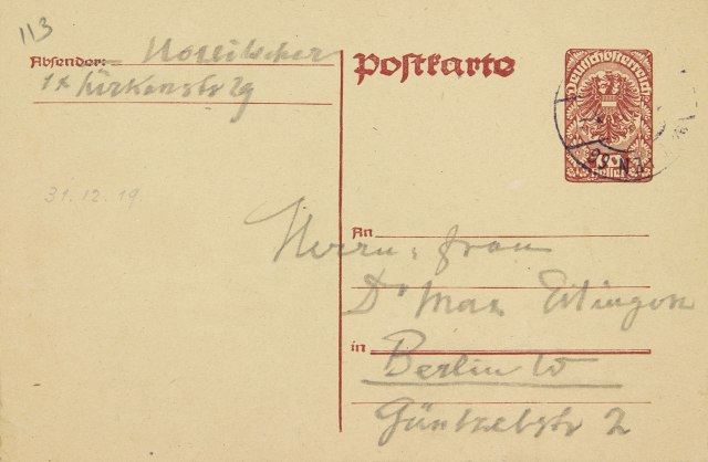 a Postkarte; adressiert an: Herrn und Frau Dr. Max Eitingon; Absender: Hollitscher, IX Türkenstr. 29. Die Grüße je in Handschrift der Unterzeichneten. Von Freud auch der letzte Eintrag, das Datum und die Adresse.