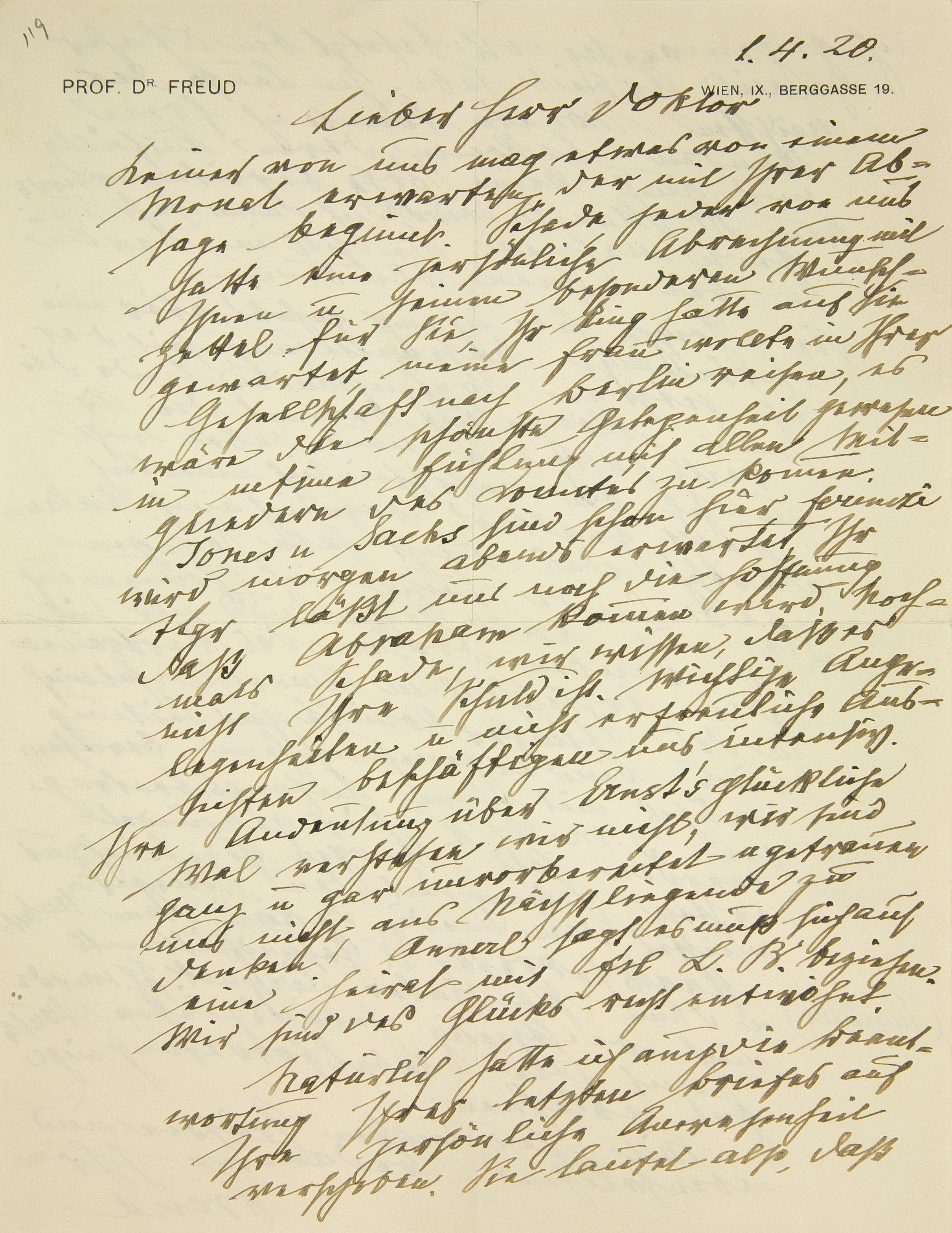 Keiner von uns mag etwas von einem Monat erwarten, der mit Ihrer Absage beginnt.1 Schade, jeder von uns hatte eine persönliche Abrechnung mit Ihnen und seinen besonderen Wunschzettel für Sie, Ihr Ring hatte auf Sie gewartet, meine Frau wollte in Ihrer Gesellschaft nach Berlin reisen, es wäre die schönste Gelegenheit gewesen, in intime Fühlung mit allen Mitgliedern des Komitees zu kommen. Jones und Sachs sind schon hier, Ferenczi wird morgen abends erwartet, Ihr Telegramm läßt uns noch die Hoffnung, daß Abraham kommen wird. Nochmals[:] Schade, wir wissen, daß es nicht Ihre Schuld ist. Wichtige Angelegenheiten und nicht erfreuliche Aussichten beschäftigen uns intensiv.