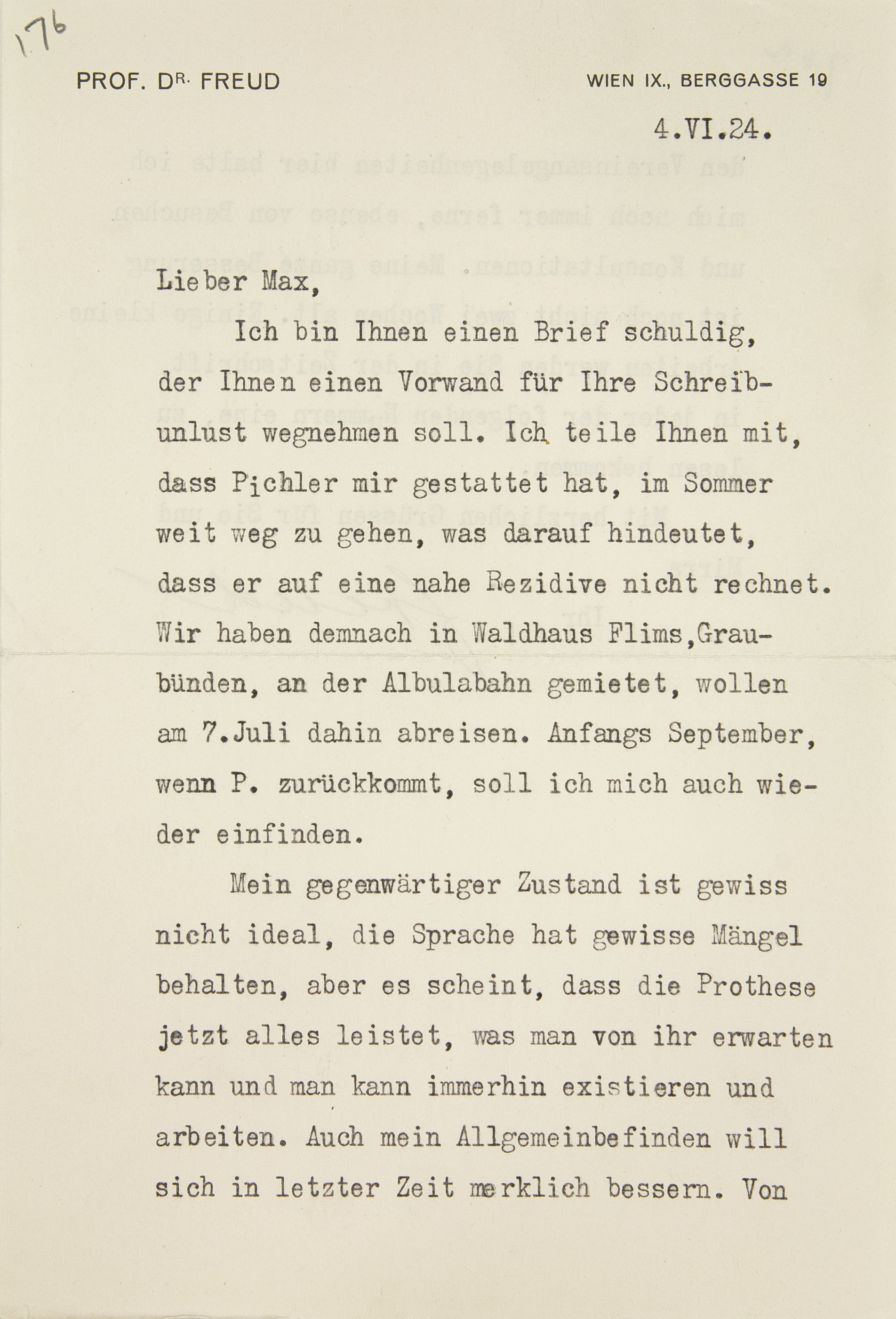 Ich bin Ihnen einen Brief schuldig, der Ihnen einen Vorwand für Ihre Schreibunlust wegnehmen soll. Ich teile Ihnen mit, daß Pichler mir gestattet hat, im Sommer weit weg zu gehen, was darauf hindeutet, daß er auf eine nahe Rezidive nicht rechnet. Wir haben demnach in Waldhaus Flims, Graubünden, an der Albulabahn gemietet, wollen am 7. Juli dahin abreisen.1 Anfangs September, wenn P. zurückkommt, soll ich mich auch wieder einfinden.