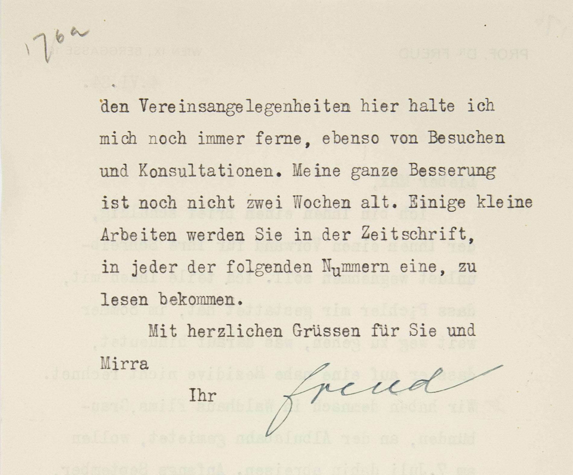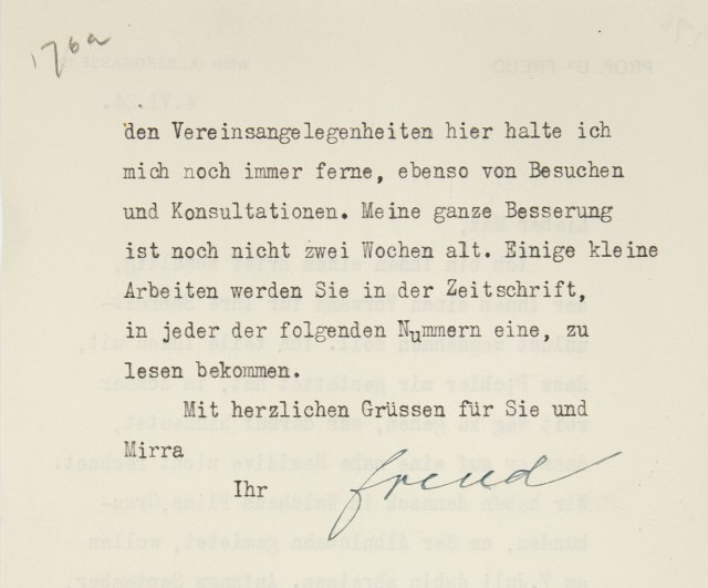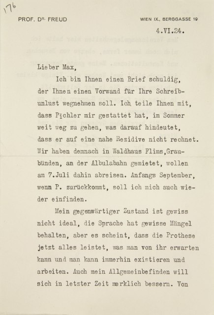 Mein gegenwärtiger Zustand ist gewiß nicht ideal, die Sprache hat gewisse Mängel behalten, aber es scheint, daß die Prothese jetzt alles leistet, was man von ihr erwarten kann, und man kann immerhin existieren und arbeiten. Auch mein Allgemeinbefinden will sich in letzter Zeit merklich bessern. Von den Vereinsangelegenheiten hier halte ich mich noch immer ferne, ebenso von Besuchen und Konsultationen. Meine ganze Besserung ist noch nicht zwei Wochen alt. Einige kleine Arbeiten werden Sie in der ‚Zeitschrift‘, in jeder der folgenden Nummern eine, zu lesen bekommen.2