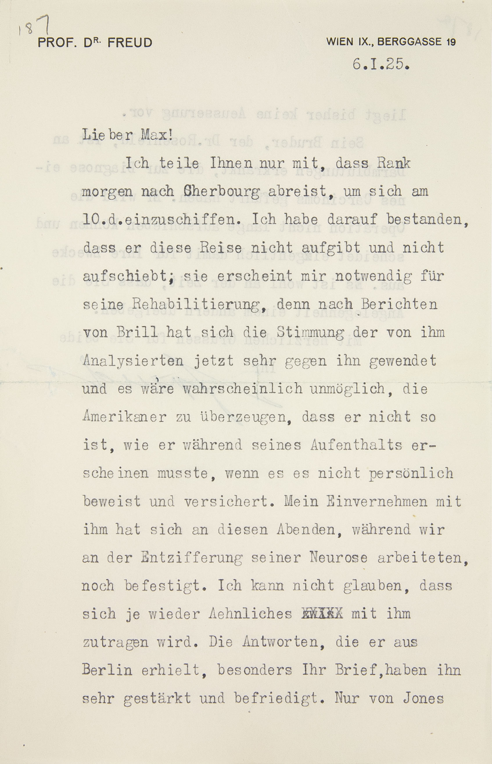 Ich teile Ihnen nur mit, daß Rank morgen nach Cherbourg abreist, um sich am 10. d. [M.] einzuschiffen. Ich habe darauf bestanden, daß er diese Reise nicht aufgibt und nicht aufschiebt; sie erscheint mir notwendig für seine Rehabilitierung, denn nach Berichten von Brill hat sich die Stimmung der von ihm Analysierten jetzt sehr gegen ihn gewendet, und es wäre wahrscheinlich unmöglich, die Amerikaner zu überzeugen, daß er nicht so ist, wie er während seines Aufenthalts erscheinen mußte, wenn er es nicht persönlich beweist und versichert. Mein Einvernehmen mit ihm hat sich an diesen Abenden, während wir an der Entzifferung seiner Neurose arbeiteten, noch befestigt. Ich kann nicht glauben, daß sich je wieder Ähnliches mit ihm zutragen wird. Die Antworten, die er aus Berlin erhielt, besonders Ihr Brief, haben ihn sehr gestärkt und befriedigt. Nur von Jones liegt bisher keine Äußerung vor.1