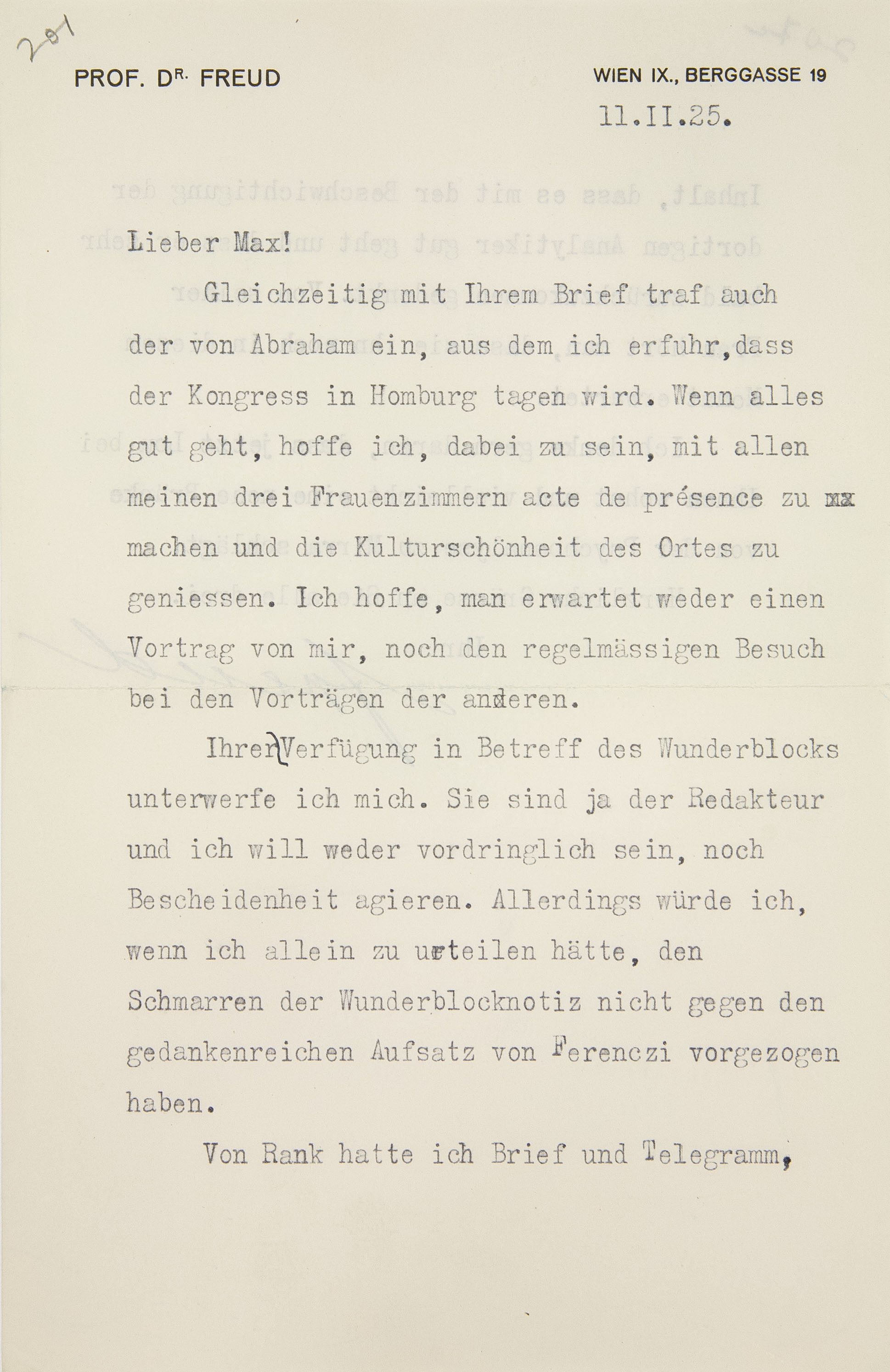 Ihrer Verfügung in betreff des ‚Wunderblocks‘ unterwerfe ich mich. Sie sind ja der Redakteur, und ich will weder vordringlich sein noch Bescheidenheit agieren. Allerdings würde ich, wenn ich allein zu urteilen hätte, den Schmarren der Wunderblocknotiz nicht gegen den gedankenreichen Aufsatz von Ferenczi vorgezogen haben.