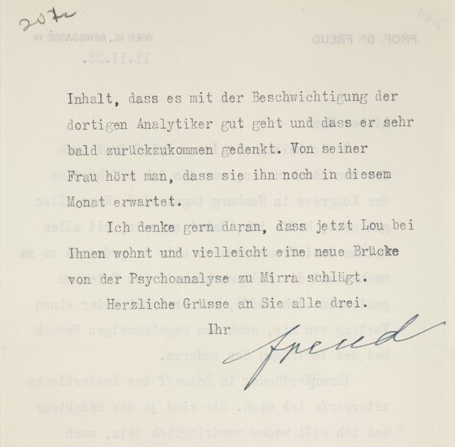 Ich denke gern daran, daß jetzt Lou bei Ihnen wohnt3 und vielleicht eine neue Brücke von der Psychoanalyse zu Mirra schlägt.