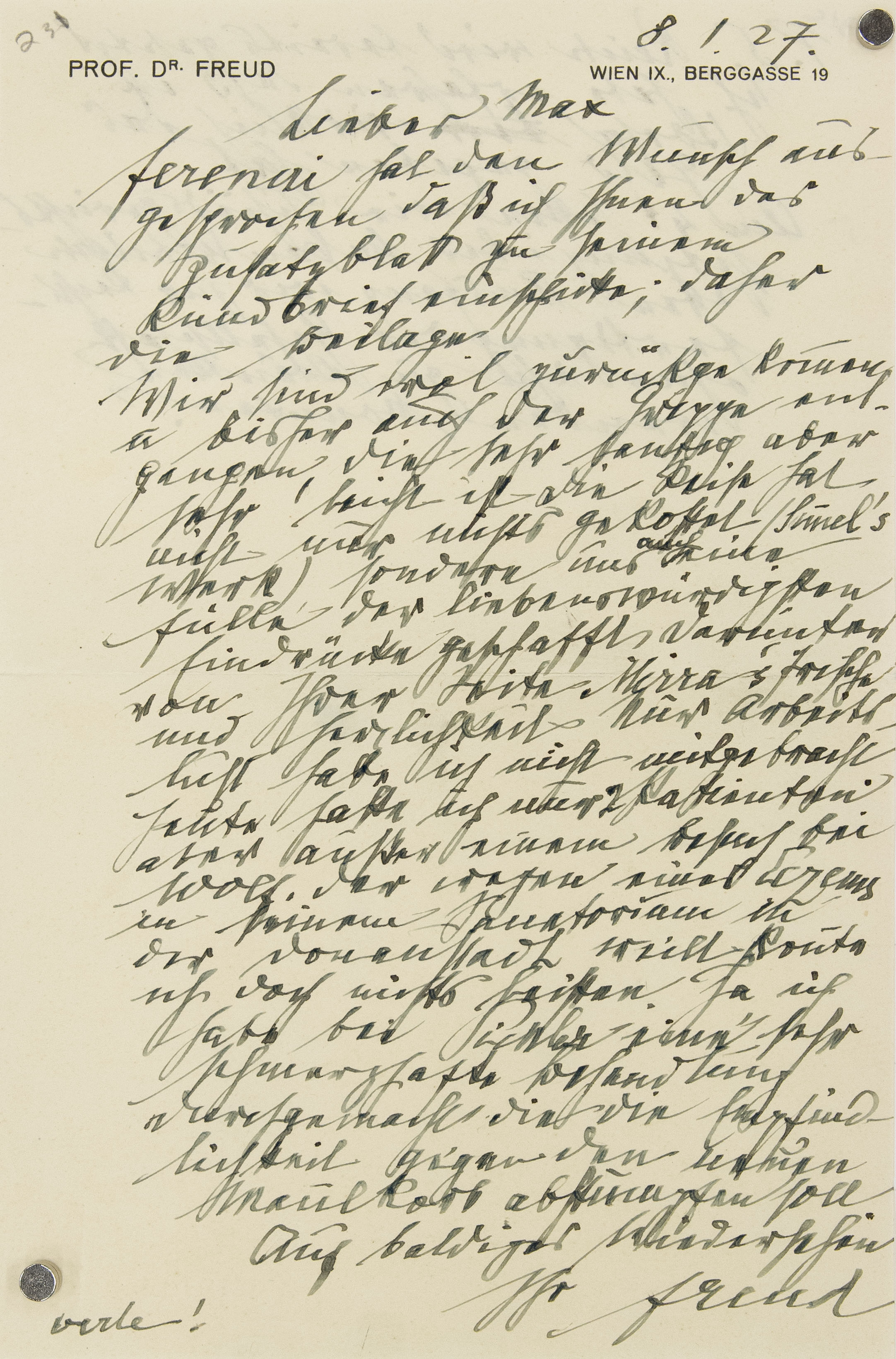 Wir sind wohl zurückgekommen und bisher auch der Grippe entgangen, die sehr häufig, aber sehr leicht ist. Die Reise hat nicht nur nichts gekostet (Simmels Werk),2 sondern uns aucha eine Fülle der liebenswürdigsten Eindrücke geschafft. Darunter von Ihrer Seite Mirras Frische und Herzlichkeit. Nur Arbeitslust habe ich nicht mitgebracht. Heute hatte ich nur zwei Patienten, aber außer einem Besuch bei Wolf,3 der wegen eines Ekzems in seinem Sanatorium in der Donaustadt4 weilt, konnte ich doch nichts leisten. Ja, ich habe bei Pichler eine sehr schmerzhafte Behandlung durchgemacht, die die Empfindlichkeit gegen den neuen Maulkorb abstumpfen soll.
