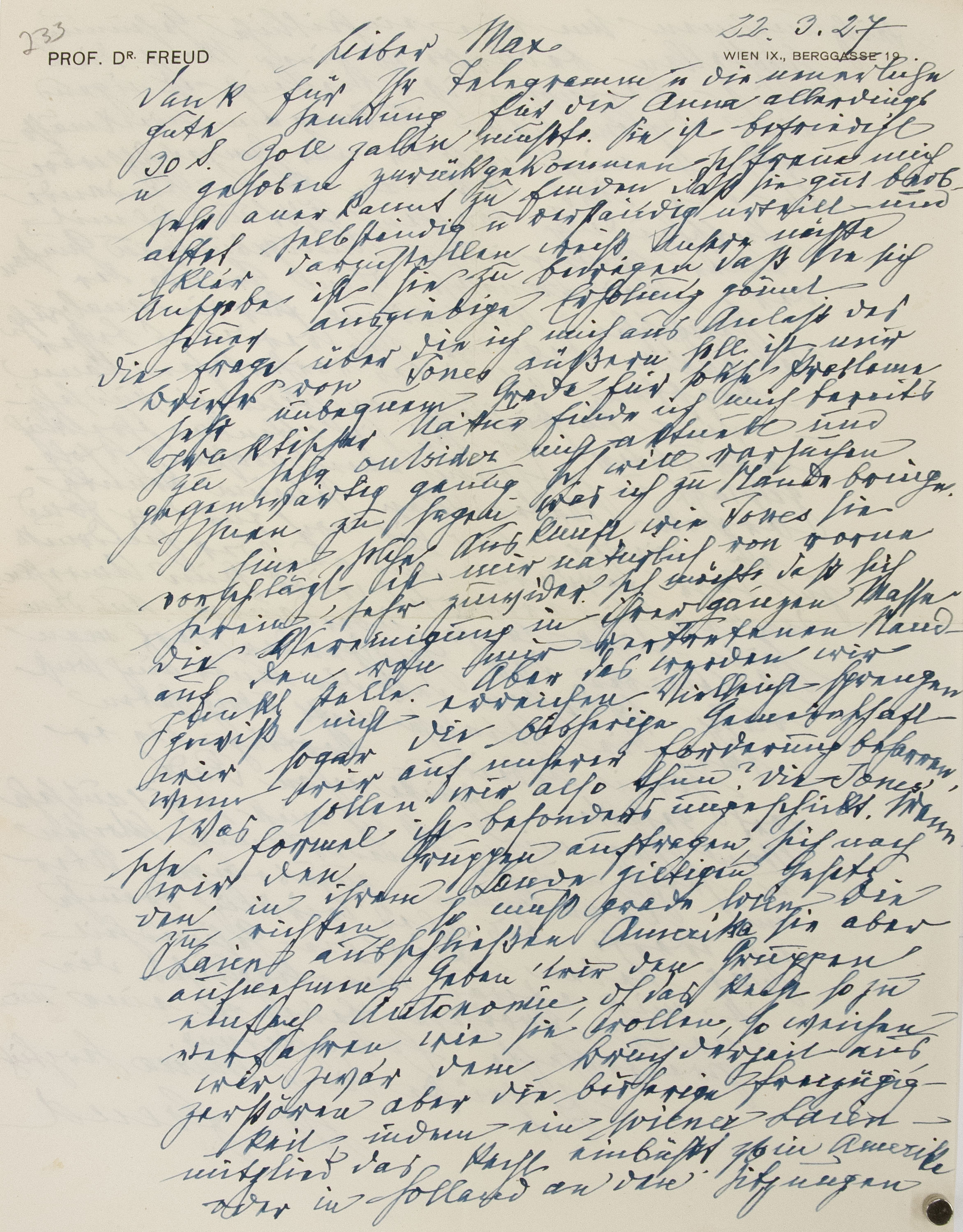 Eine solche Auskunft, wie Jones sie vorschlägt, ist mir natürlich von vorne herein sehr zuwider. Ich möchte, daß sich die Vereinigung in ihrer ganzen Masse auf den von mir vertretenen Standpunkt stelle. Aber das werden wir gewiß nicht erreichen. Vielleicht sprengen wir sogar die bisherige Gemeinschaft, wenn wir auf unserer Forderung beharren. Was sollen wir also tun? Die Jonessche Formel ist besonders ungeschickt. Wenn wir den Gruppen auftragen, sich nach den in ihrem Lande giltigen Gesetz[en] zu richten, so muß grade Wien die Laien ausschließen, Amerika sie aber aufnehmen. Geben wir den Gruppen einfach Autonomie, d. h. das Recht, so zu verfahren, wie sie wollen, so weichen wir zwar dem Bruch derzeit aus, zerstören aber die bisherige Freizügigkeit, indem ein Wiener Laienmitglied das Recht einbüßt, z. B. in Amerika oder in Holland an den Sitzungen teilzunehmen. Um eine einheitliche Gesinnung herzustellena, bedürfte es einer Macht, die nicht verfügbar ist. Vielleicht ist irgendein diplomatischer Ausweg am zweckmäßigsten – nicht daß er mir sympathisch wäre – in der Art, daß man keine bindende Entscheidung treffen läßt und sich mit einer prinzipiellen Kundgebung zugunsten der Laienanalyse, d. h. im Grunde der spezifischen Ausbildung für die analytische Tätigkeit, begnügt. Sie werden es besser treffen, als ich es vorhersehen kann. –b