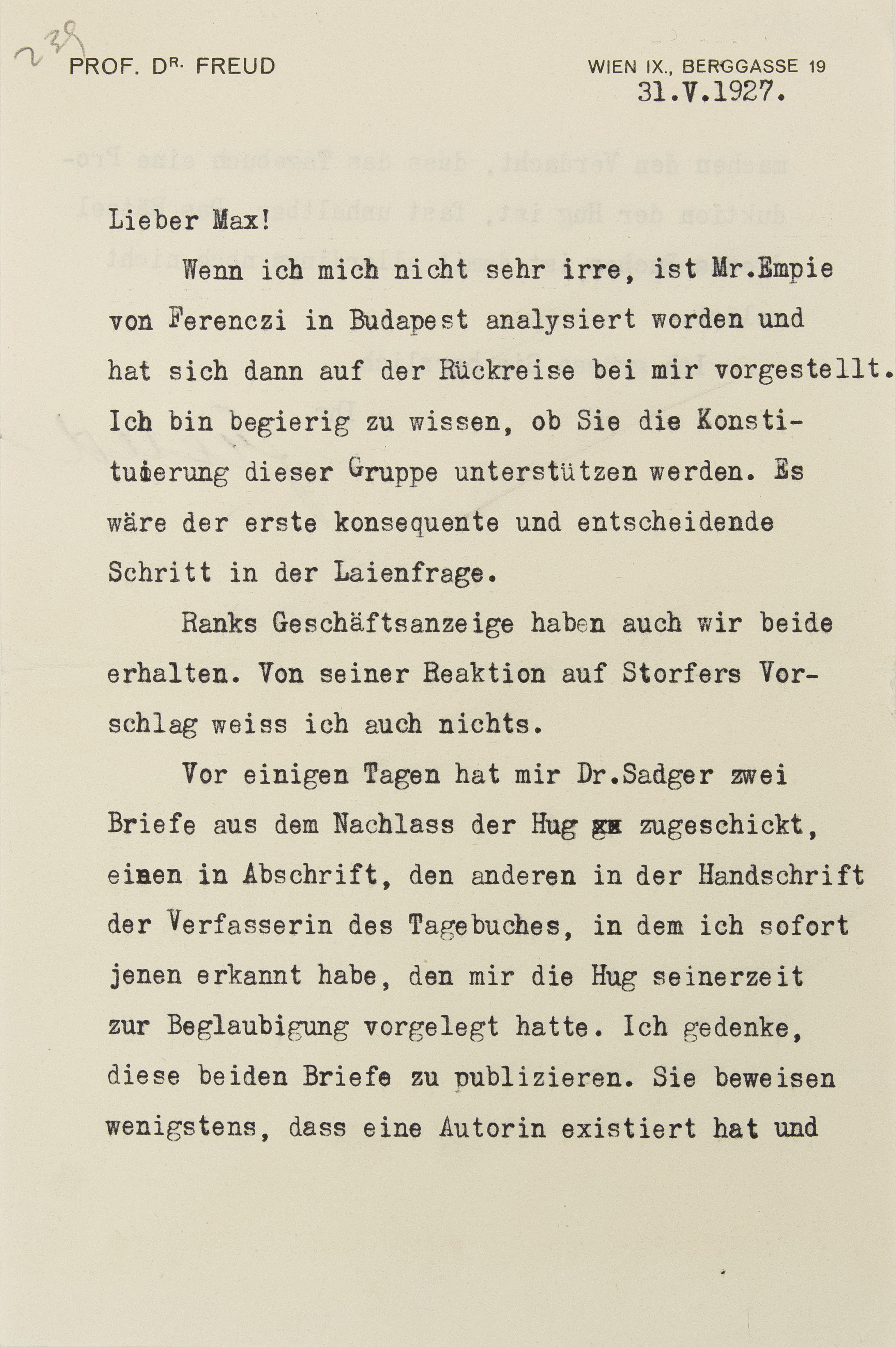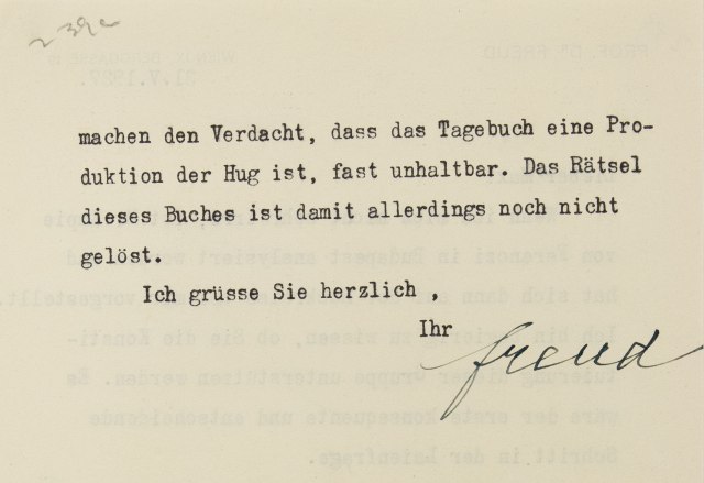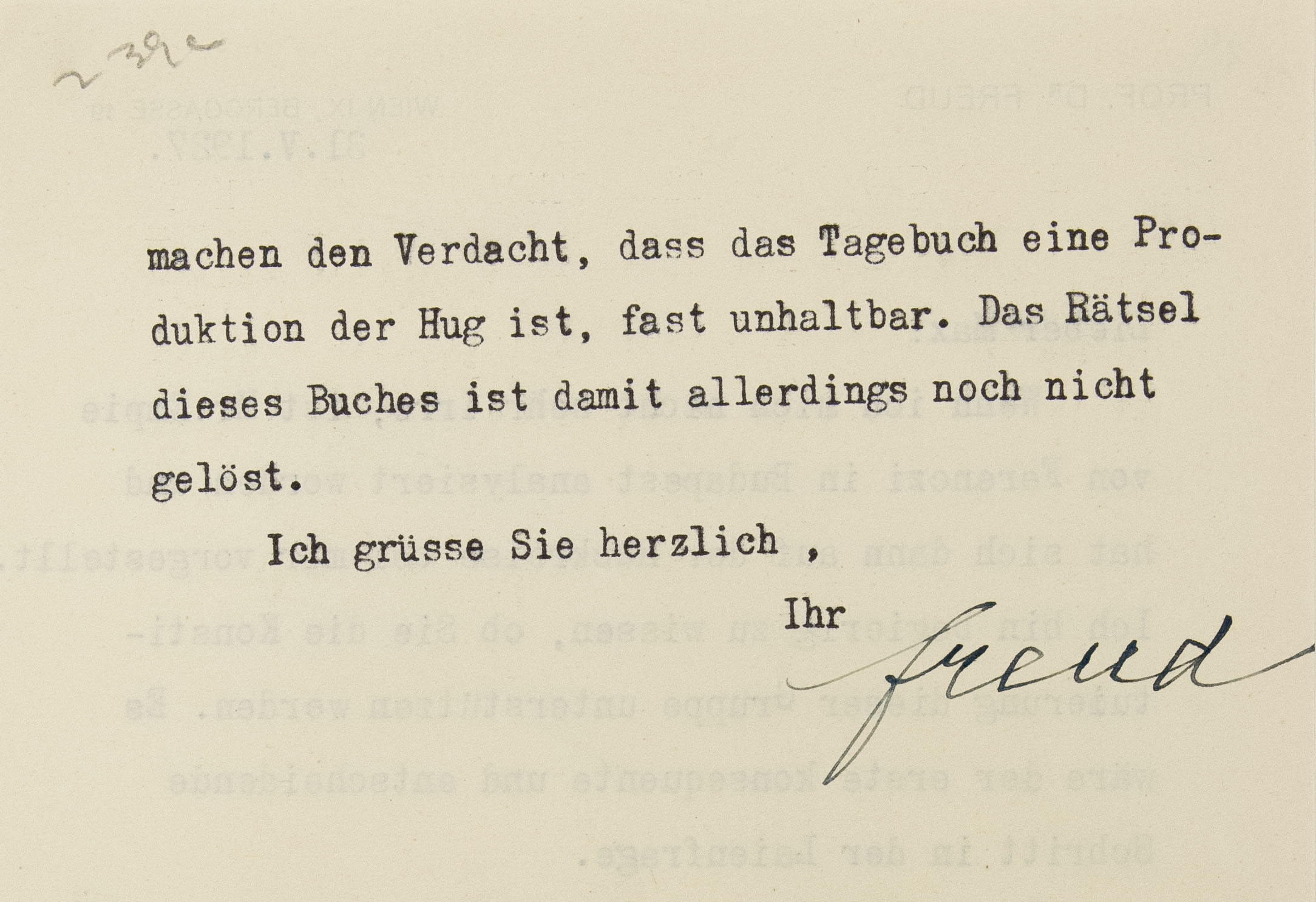 Vor einigen Tagen hat mir Dr. Sadger2 zwei Briefe aus dem Nachlaß der Hug zugeschickt, einen in Abschrift, den anderen in der Handschrift der Verfasserin des ‚Tagebuches‘, in dem ich sofort jenen erkannt habe, den mir die Hug seinerzeit zur Beglaubigung vorgelegt hatte. Ich gedenke, diese beiden Briefe zu publizieren.3 Sie beweisen wenigstens, daß eine Autorin existiert hat, und machen den Verdacht, daß das ‚Tagebuch‘ eine Produktion der Hug ist, fast unhaltbar. Das Rätsel dieses Buches ist damit allerdings noch nicht gelöst.